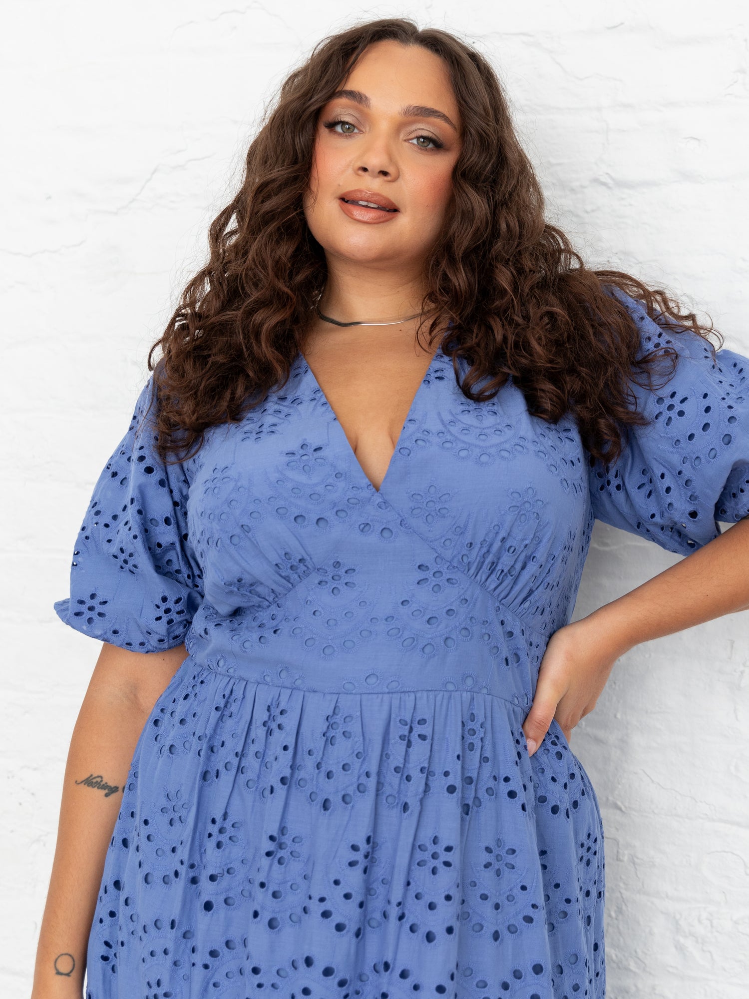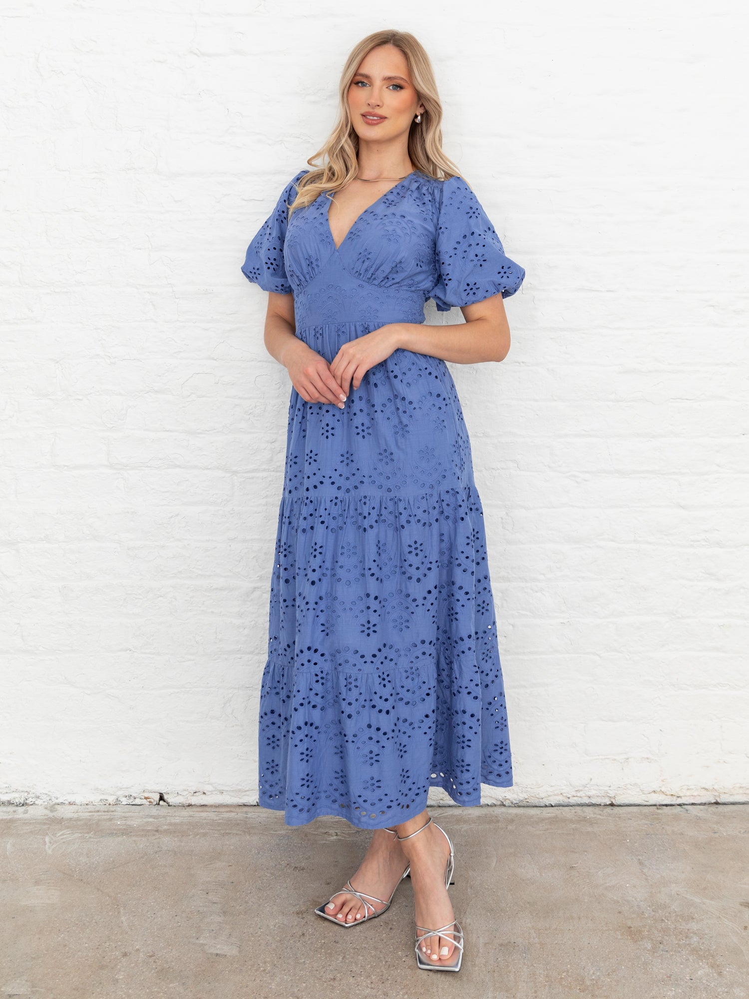 Lovedrobe Blue Broderie Puff Sleeve Tiered Midi Dress