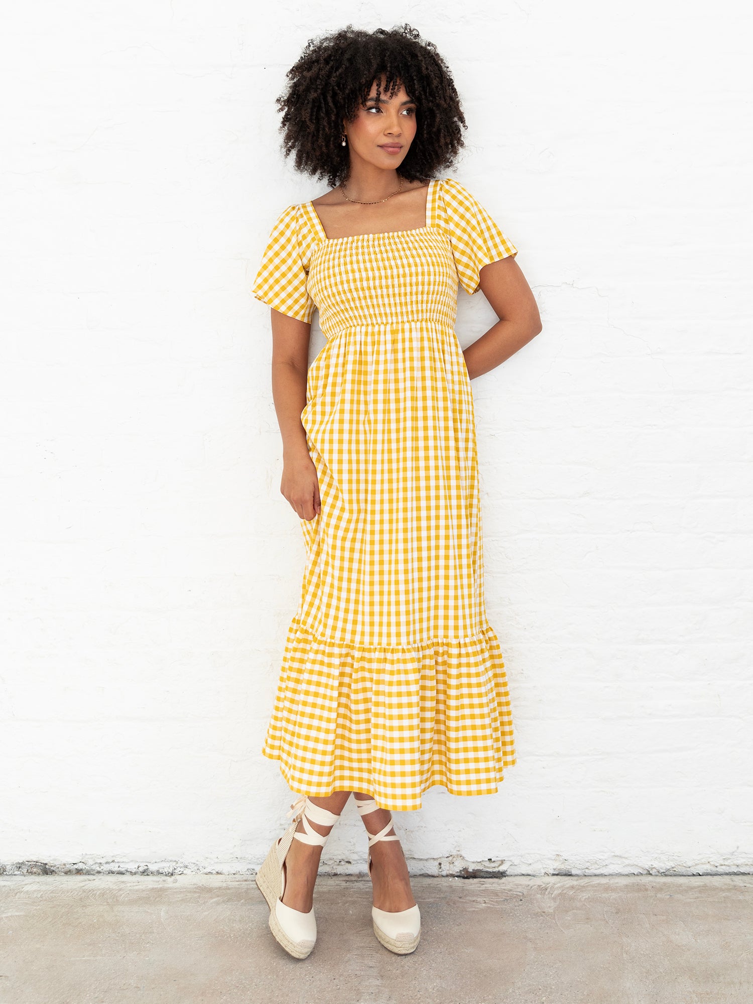 Introducing our elevated Milkmaid Midaxi; a perfect addition to your summertime wardrobe. This yellow gingham dress blends classic features such as a flattering shirred bodice and a square neckline. The short angel sleeves add a delicate romantic touch while the flowing midaxi-length skirt falls just above the ankle into an A-line silhouette. Ideal for warm-weather outings from after-work drinks to weekend strolls in the park. Style with sandals or trainers for a relaxed yet stylish look.