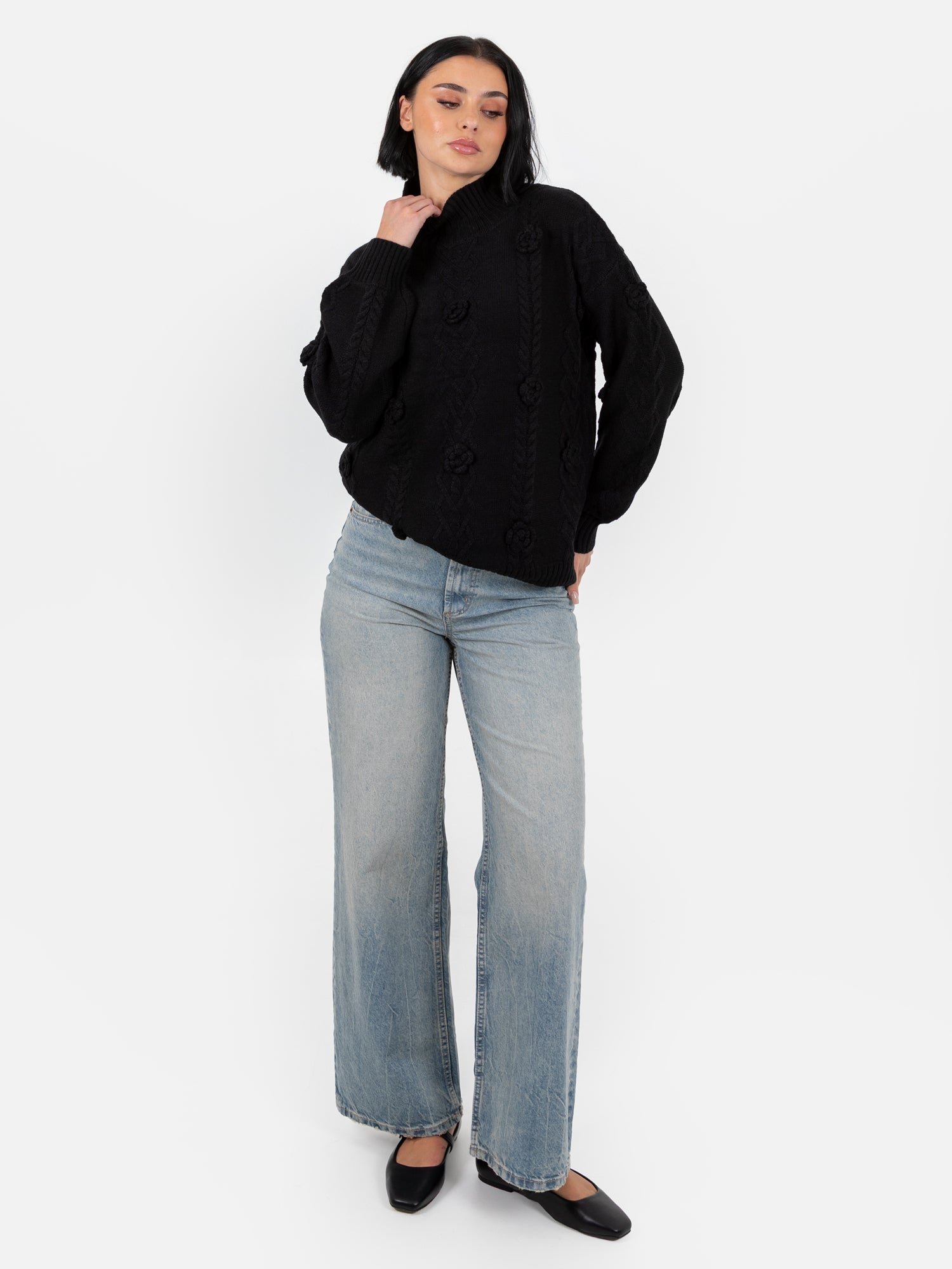 Lovedrobe Black Cable Knit High Neck Jumper with Floral Detail