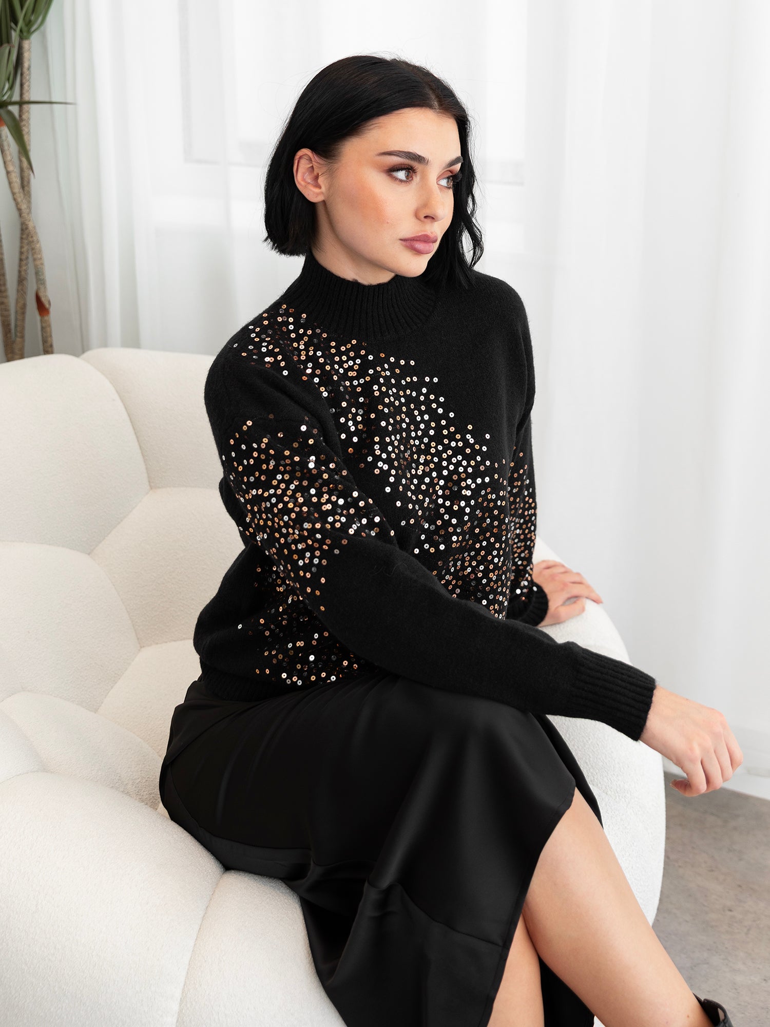 Add a little sparkle to your cosy looks! Designed with a high ribbed neckline this black jumper offers a classic style with shimmering embellishments that adorns the front and long sleeves. Perfect for a night out with friends pair this jumper with jeans and heels for a chic evening look.
