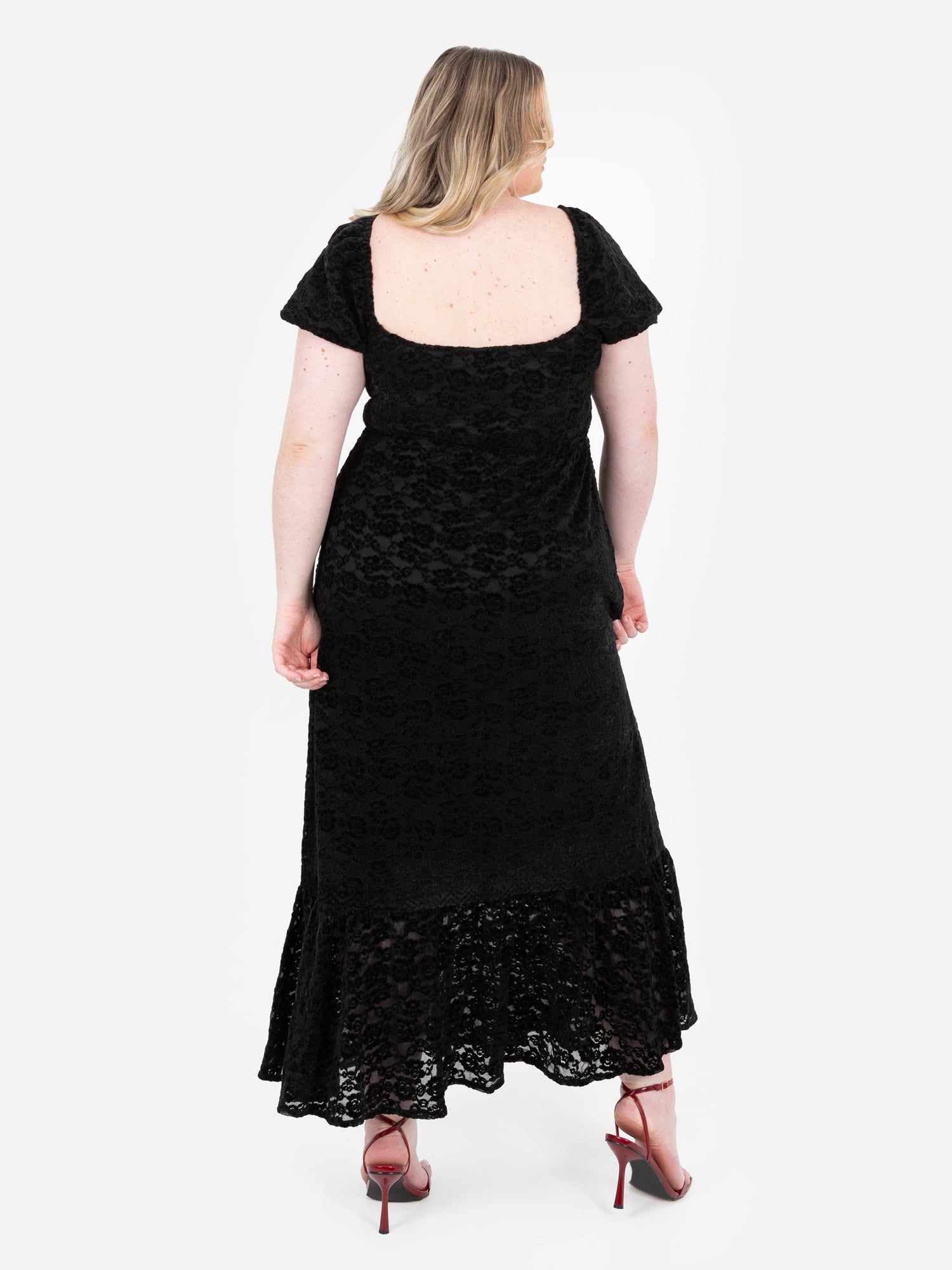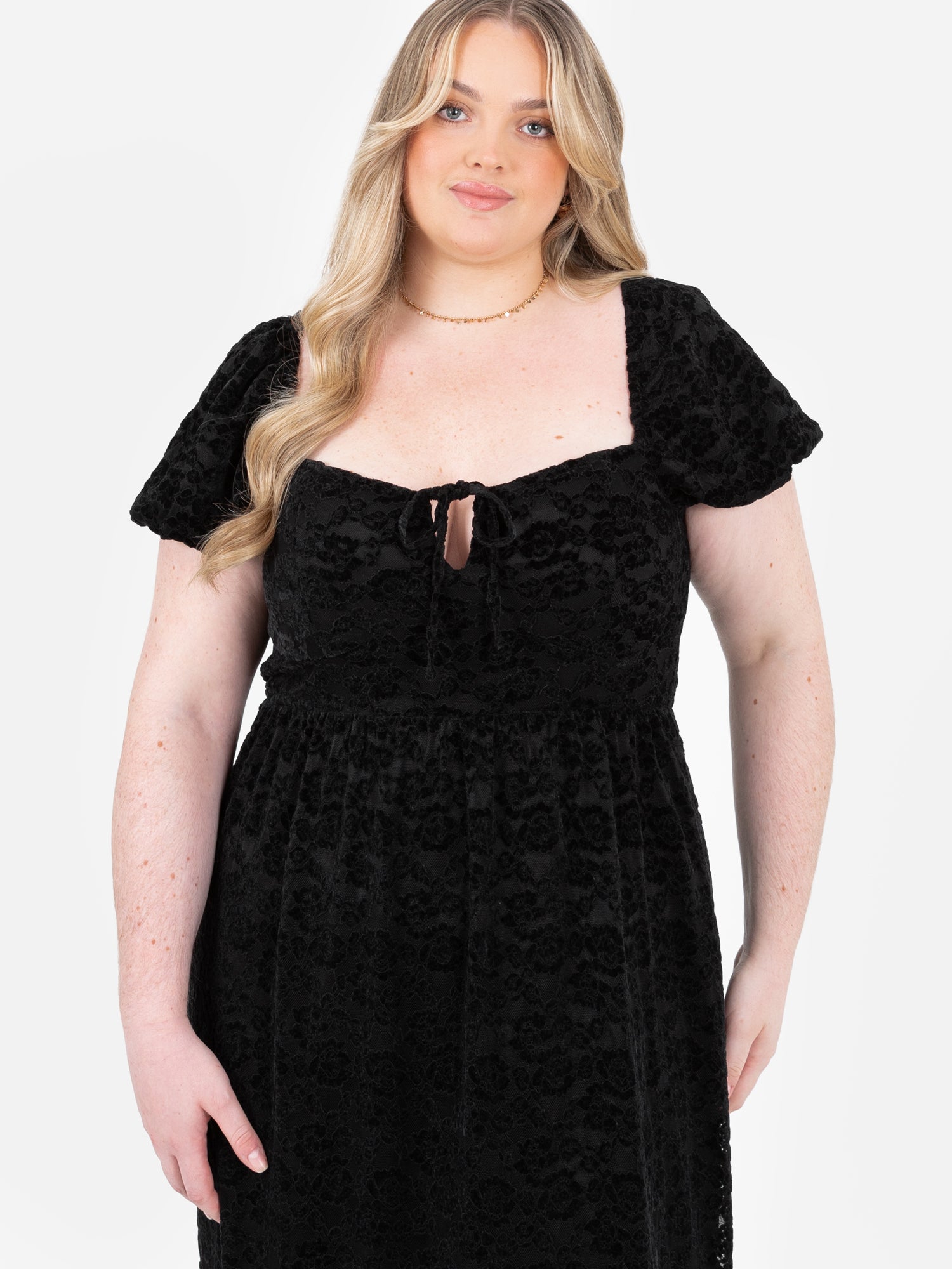 Crafted from luxuriously textured floral velvet and lace fabric, this black dress blends opulence with effortless comfort. The elasticated square neckline features a delicate V cutout with matching ties, while short puff sleeves bring vintage charm. An elasticated waist enhances the figure, flowing into a midaxi length skirt with a sheer gathered panel and ruffled hem for graceful movement. Pair with black heels and silver accessories for an elegant finish.