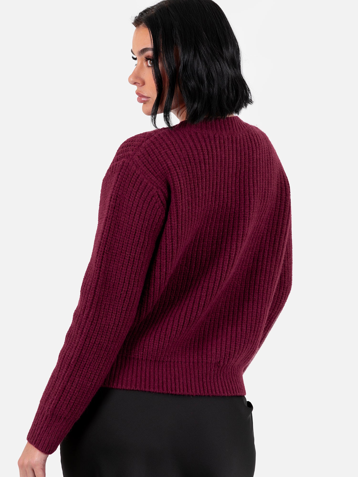 Lovedrobe Bow Button Round Neck Burgundy Cardigan