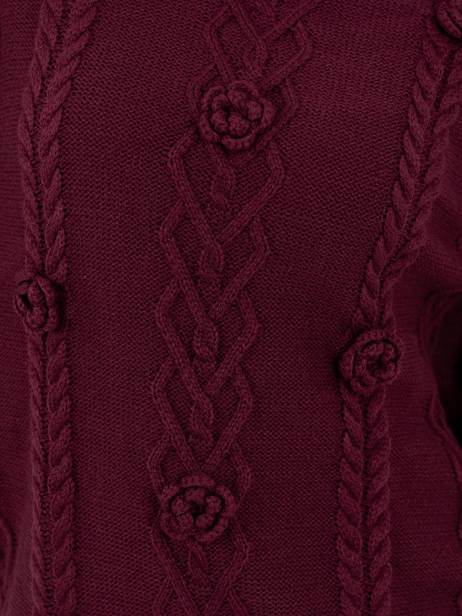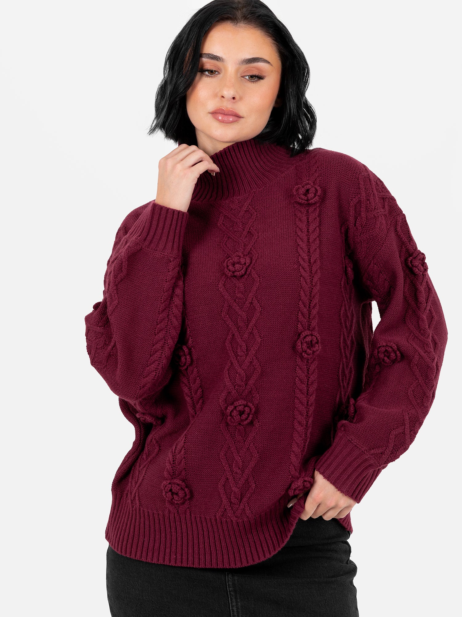 Lovedrobe Burgundy Cable Knit High Neck Jumper with Floral Detail