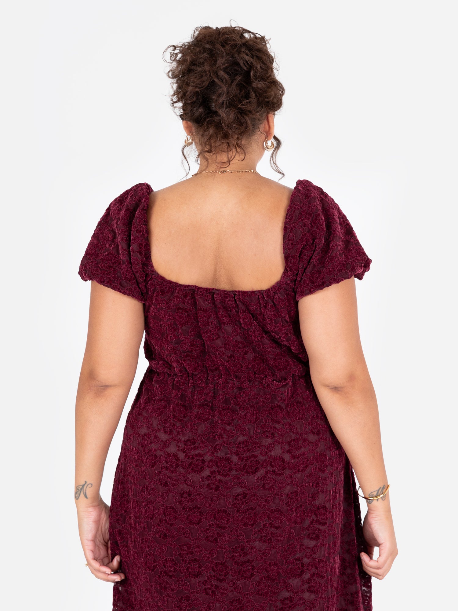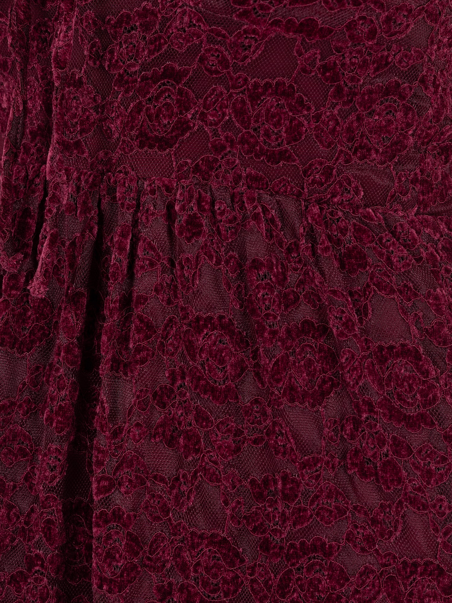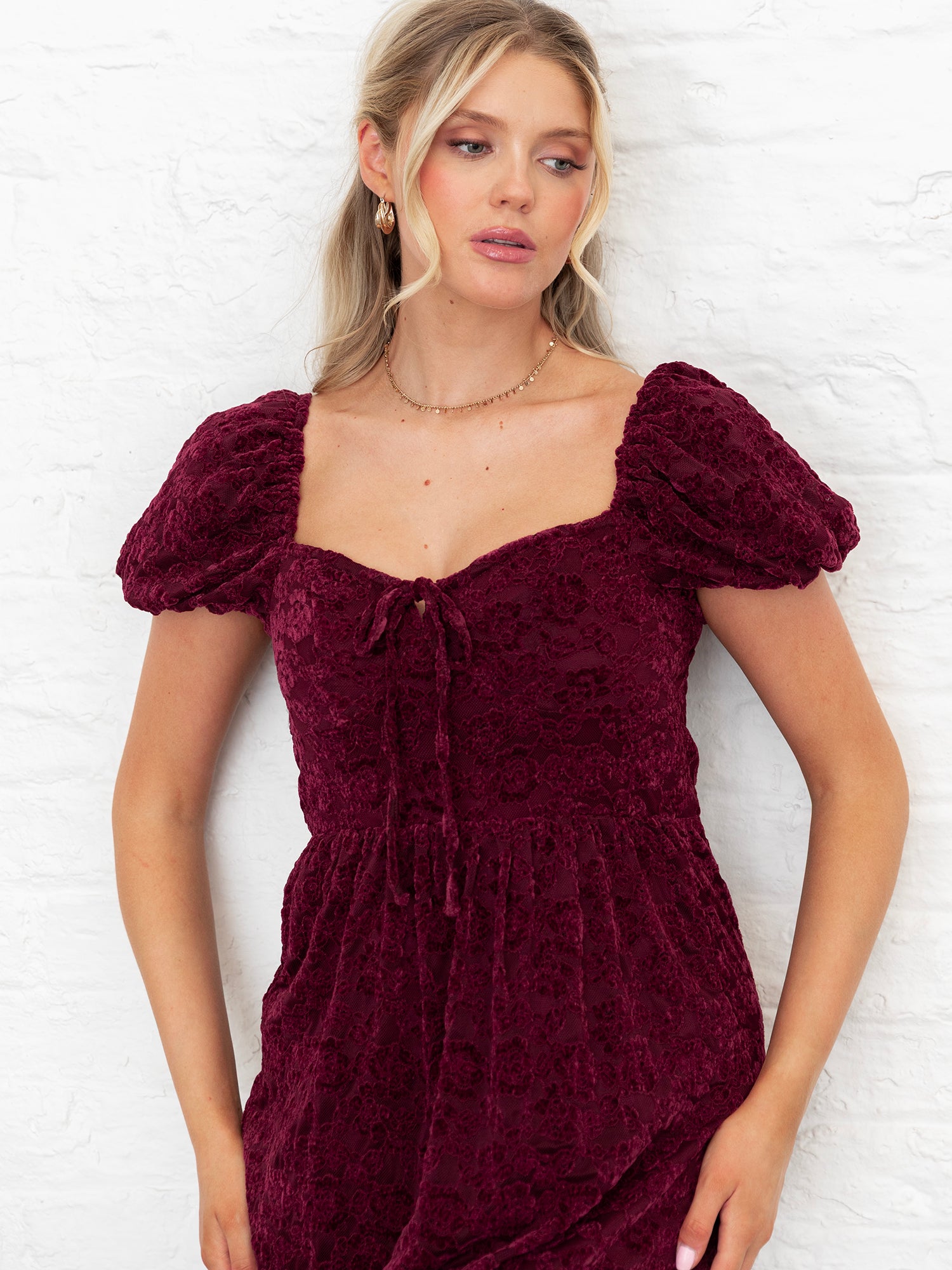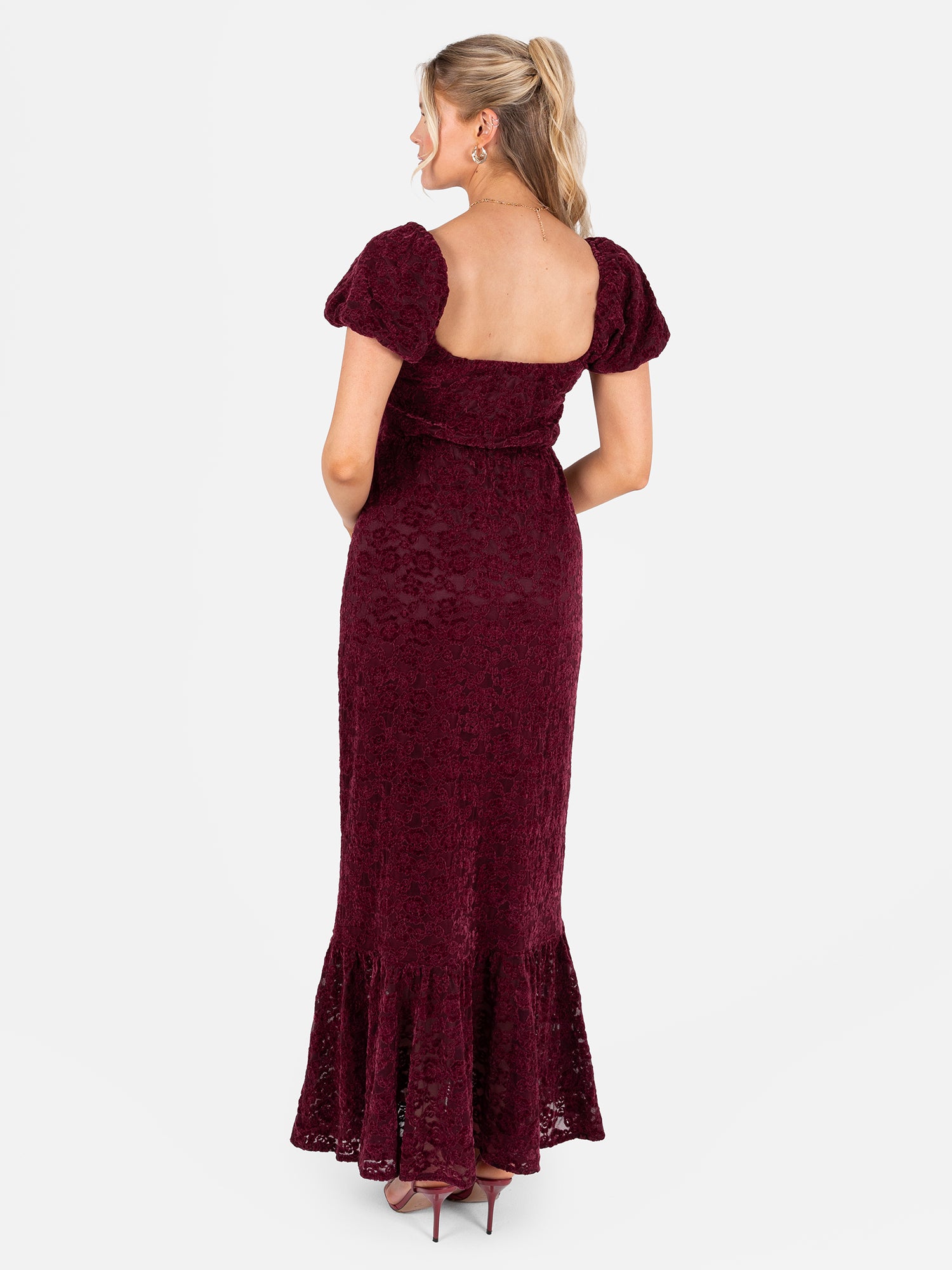 Crafted from richly textured floral velvet lace in a deep burgundy hue, this dress exudes playful elegance and a charming silhouette. The fitted bodice features short, puffed sleeves with elasticated shoulders and a square neckline, finished with matching ties that fasten into a perfect bow. A lightly pleated elasticated waist flows into a relaxed A-line skirt, enhanced by sheer panelling that creates an ankle-grazing length for added movement and allure. Perfect for evening occasions, pair with gold heels and shimmering accessories for a radiant finish.