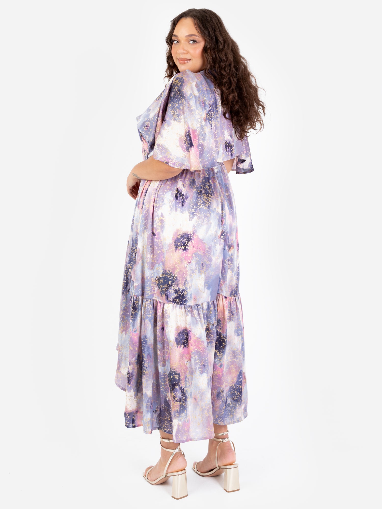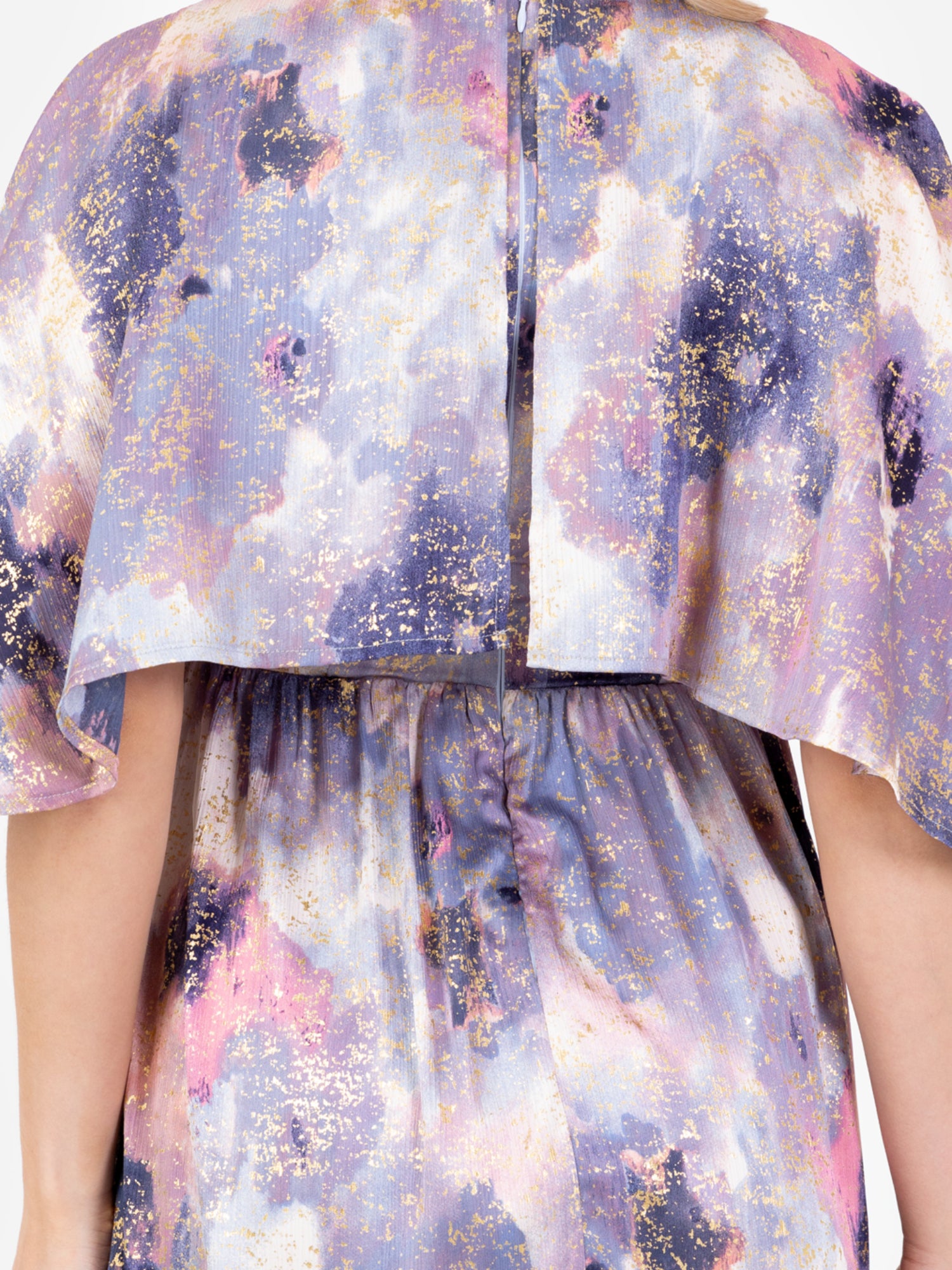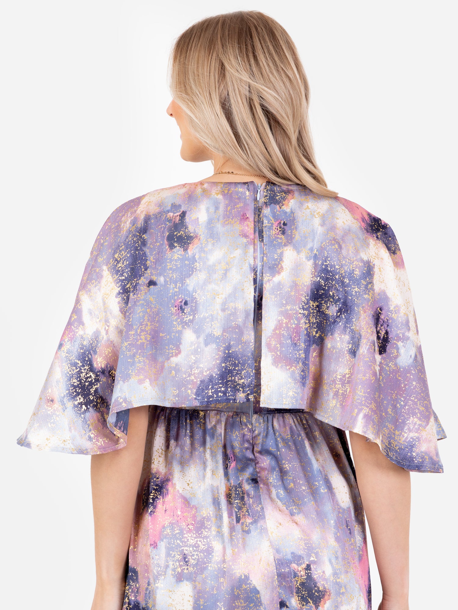 A fun and vibrant choice for brunch with friends or wedding celebrations. This dress features a stunning cape-style overlay flowing into short angel sleeves lending a whimsical airy feel. The textured fabric's purple marble design accented with hints of gold foil adds a contemporary and eye-catching element. With its high-low skirt design this piece lets you show off your favourite heels while allowing you to dance with ease. Style this V-neck dress with gold heels and statement jewellery for an effortlessly elegant look.