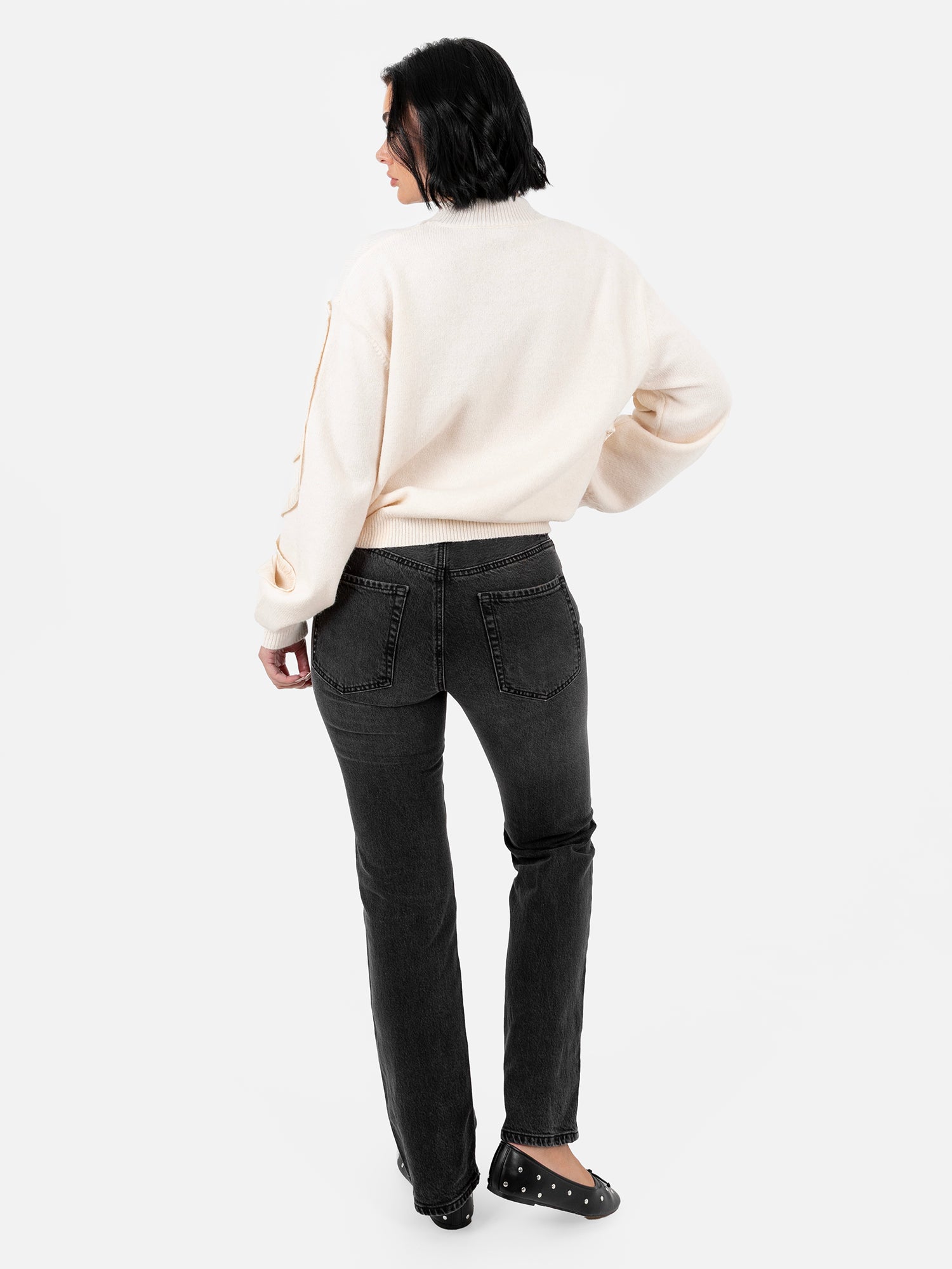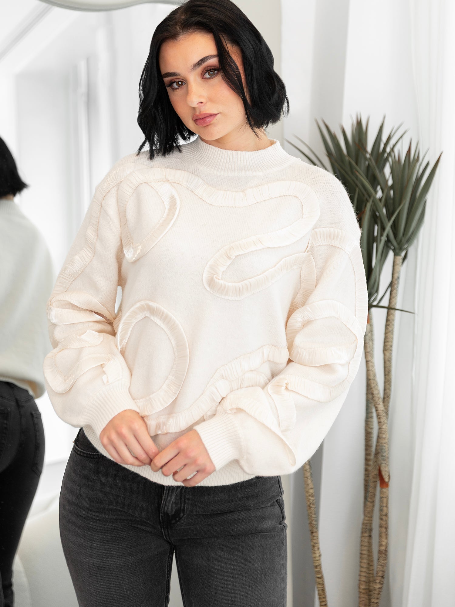 A cozy knit with a sculptural twist, this jumper blends comfort with standout design. Designed with a modern high neckline and relaxed dropped shoulders, this soft knit is both comfortable and fashion-forward. Ribbed cuffs and hem offer a snug finish, while the standout feature lies in the satin ribbon detailing: a unique squiggle-and-loop applique that starts at the right sleeve cuff, sweeps across the bodice, and flows onto the left arm. Light gathering in the satin adds texture and dimension, creating an eye-catching, sculptural effect that moves with you.