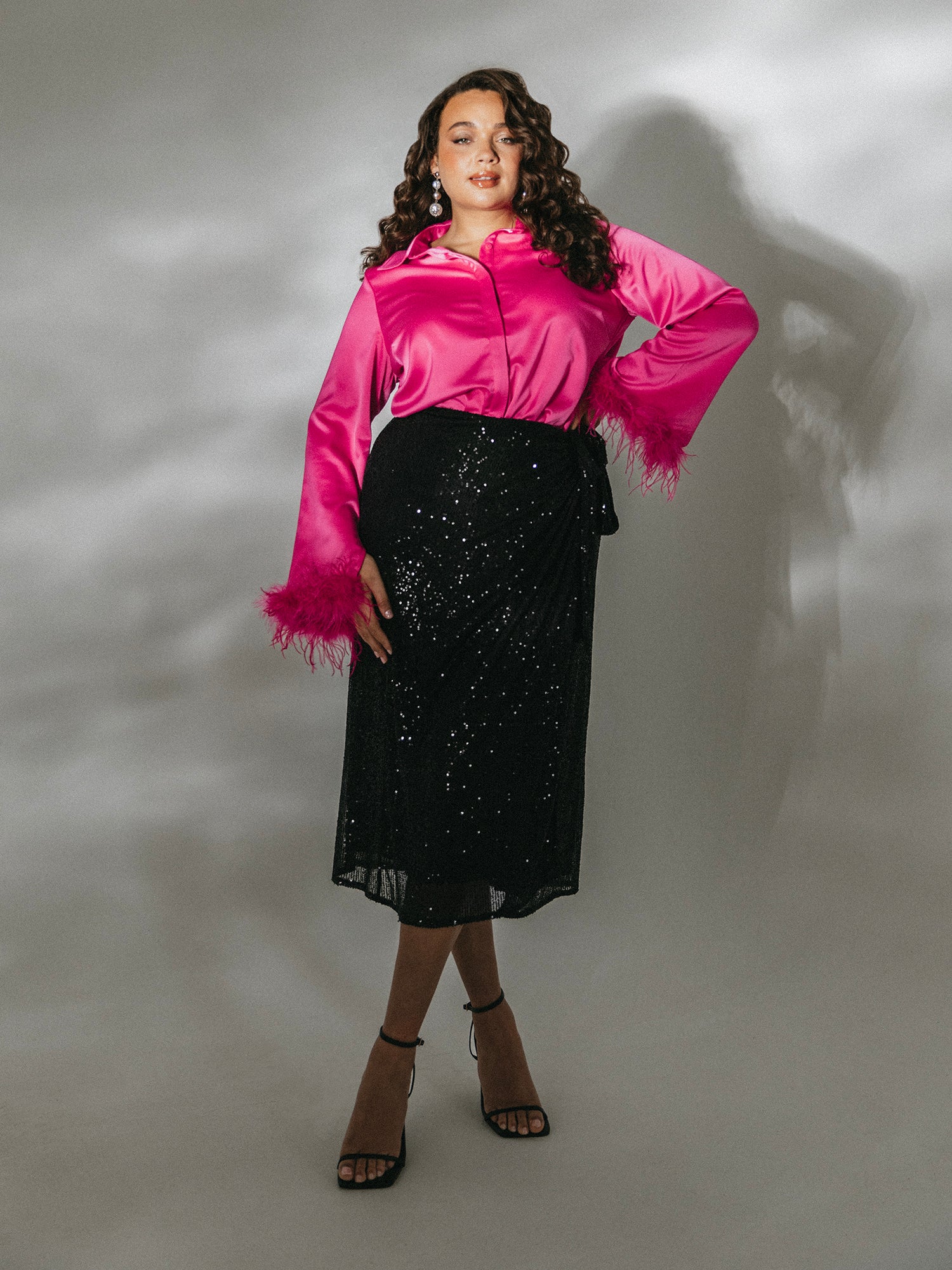 This Pink blouse will become your go-to styling piece this season. Classic button up design is elevated by the Satin fabric its crafted from as well as the button overlay for a seamless look. Most notably its feather cuffs take this blouse from workwear to party-wear. Style this long sleeve shirt with trousers and heels for a classy ensemble or pair with our Sequin Wrap Midi Skirts for a shimmering party look.