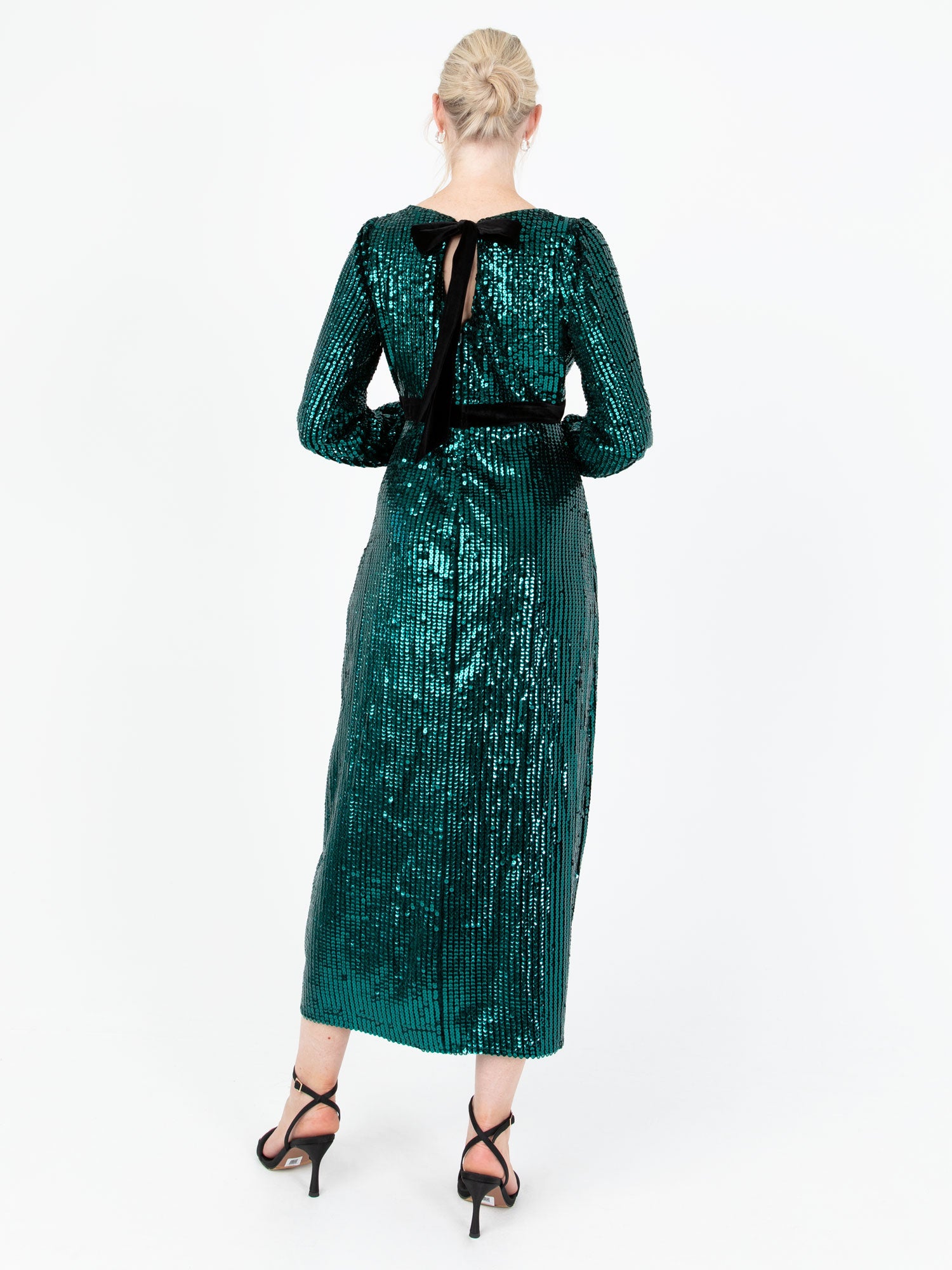 A luxurious Velvet design that's perfect for the holiday season with its fully embellished finish. The faux-wrap silhouette flatters any figure creating an effortlessly elegant look that's both timeless and on-trend. This emerald piece features long sleeves perfect for the cooler evening parties so you don’t have to worry about layering. Keyhole detail to the reverse with black velvet ribbon fastening adds a touch of playful charm. Keep it classic with black heels and a clutch or further accessorise this shimmering dress with silver statement earrings.