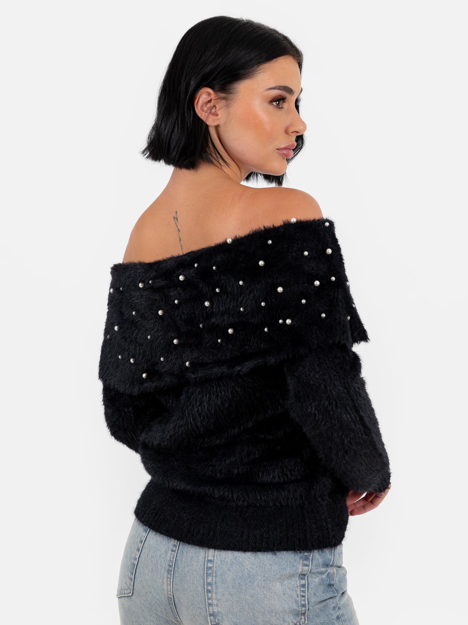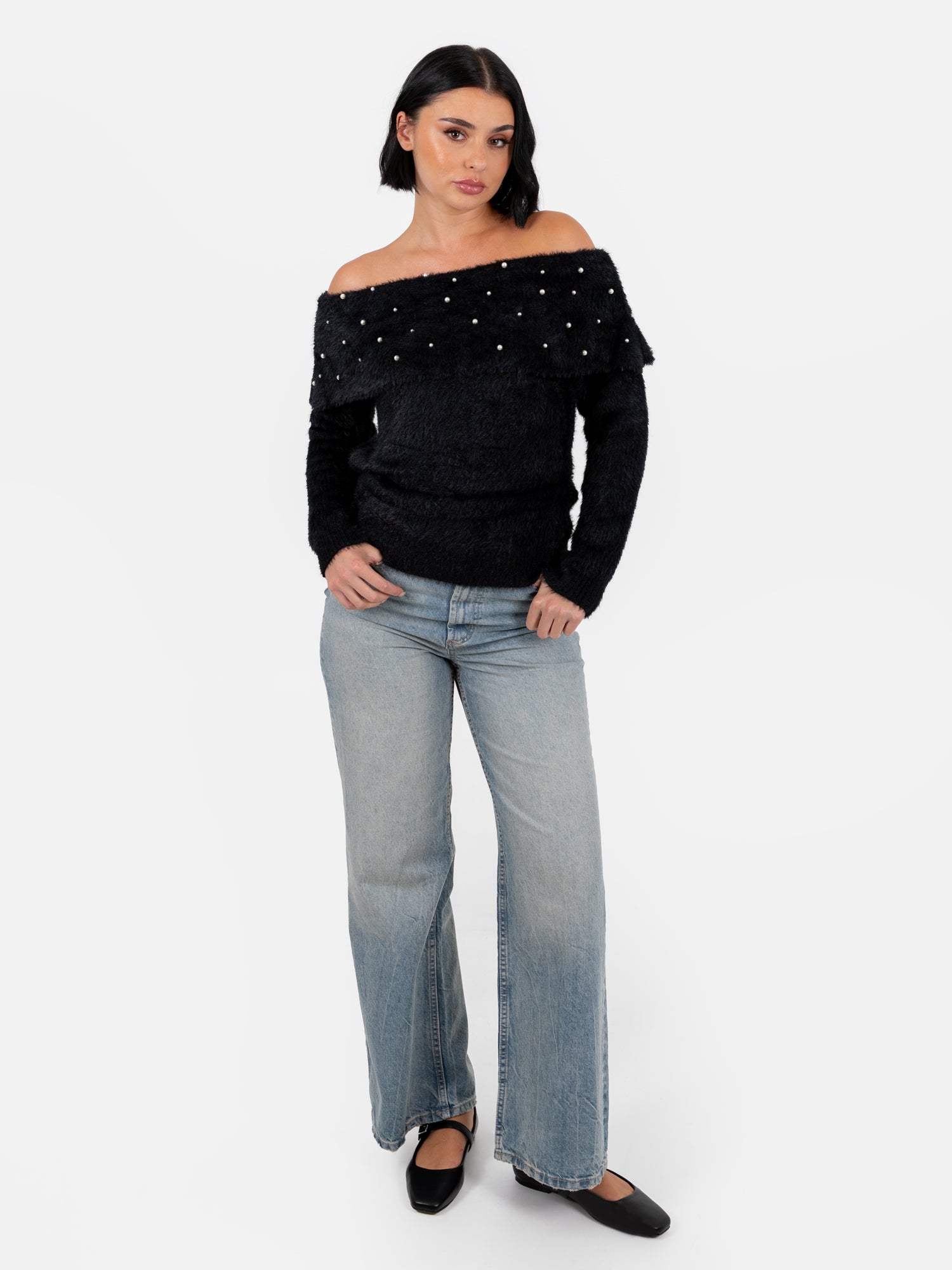 Lovedrobe Pearl Embellished Black Bardot Jumper