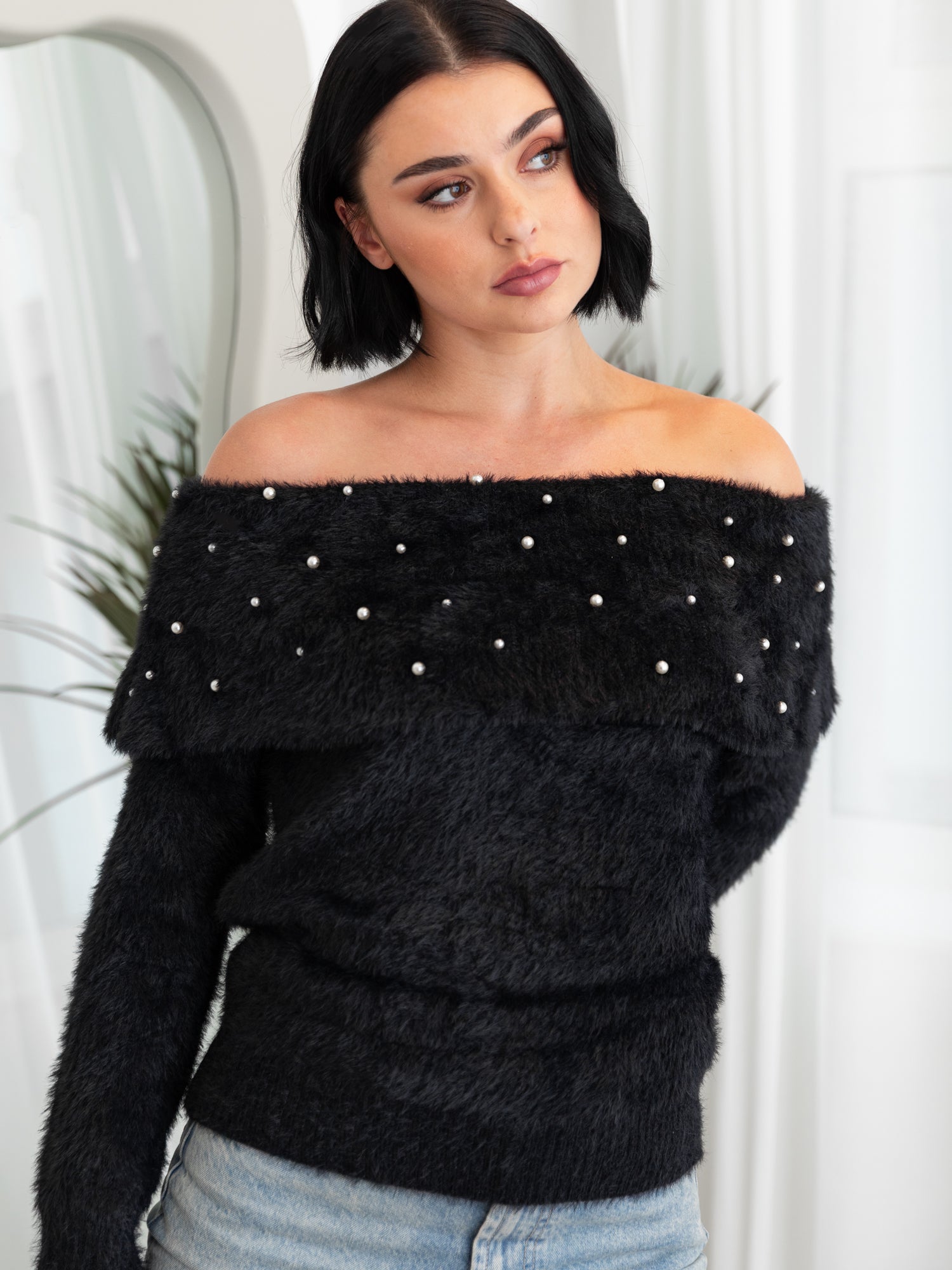 Indulge in the glamour of 'off-the-shoulder' fashion this season. This cosy eyelash knit jumper embraces the trend with its charming folded-over neckline adorned with delicate ivory pearls creating an elegant piece you’ll want to keep in your rotation. Its length makes it versatile piece you can wear tucked in with a skirt and heels for an evening ensemble or layer it over leather trousers for a more understated yet stylish look.