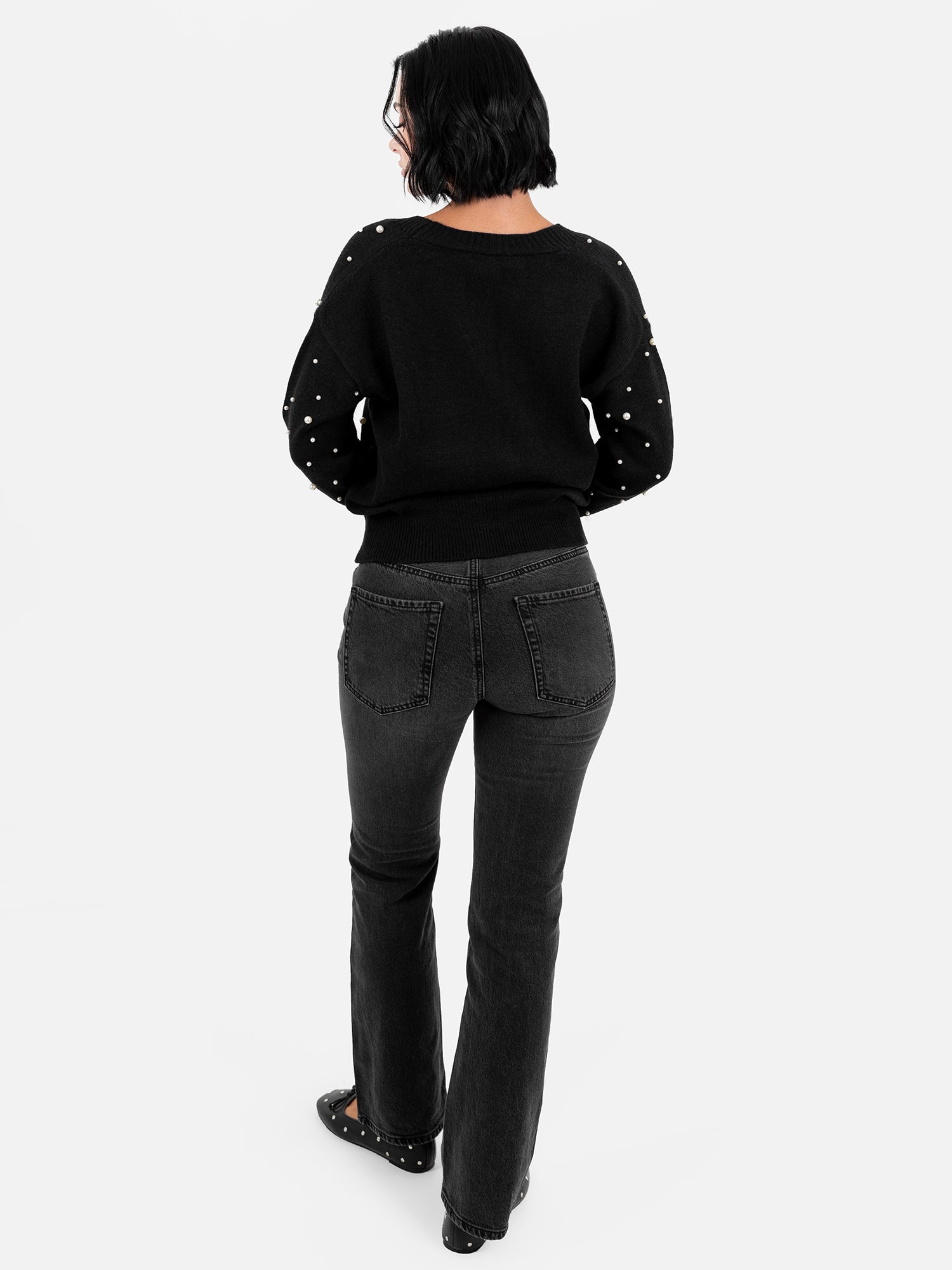 Looking for a cosy yet stylish occasion layering piece? This black cardigan ticks all the boxes, featuring pearl embellishment across the dropped shoulders, long sleeves, and front bodice. Pearl buttons add a refined touch, while the V neckline, cuffs, and hem are finished with a ribbed design, offering subtle texture and structure. For a romantic date night, pair it with a mini skirt and heels or style it over a cami top and jeans for effortless daytime elegance.
