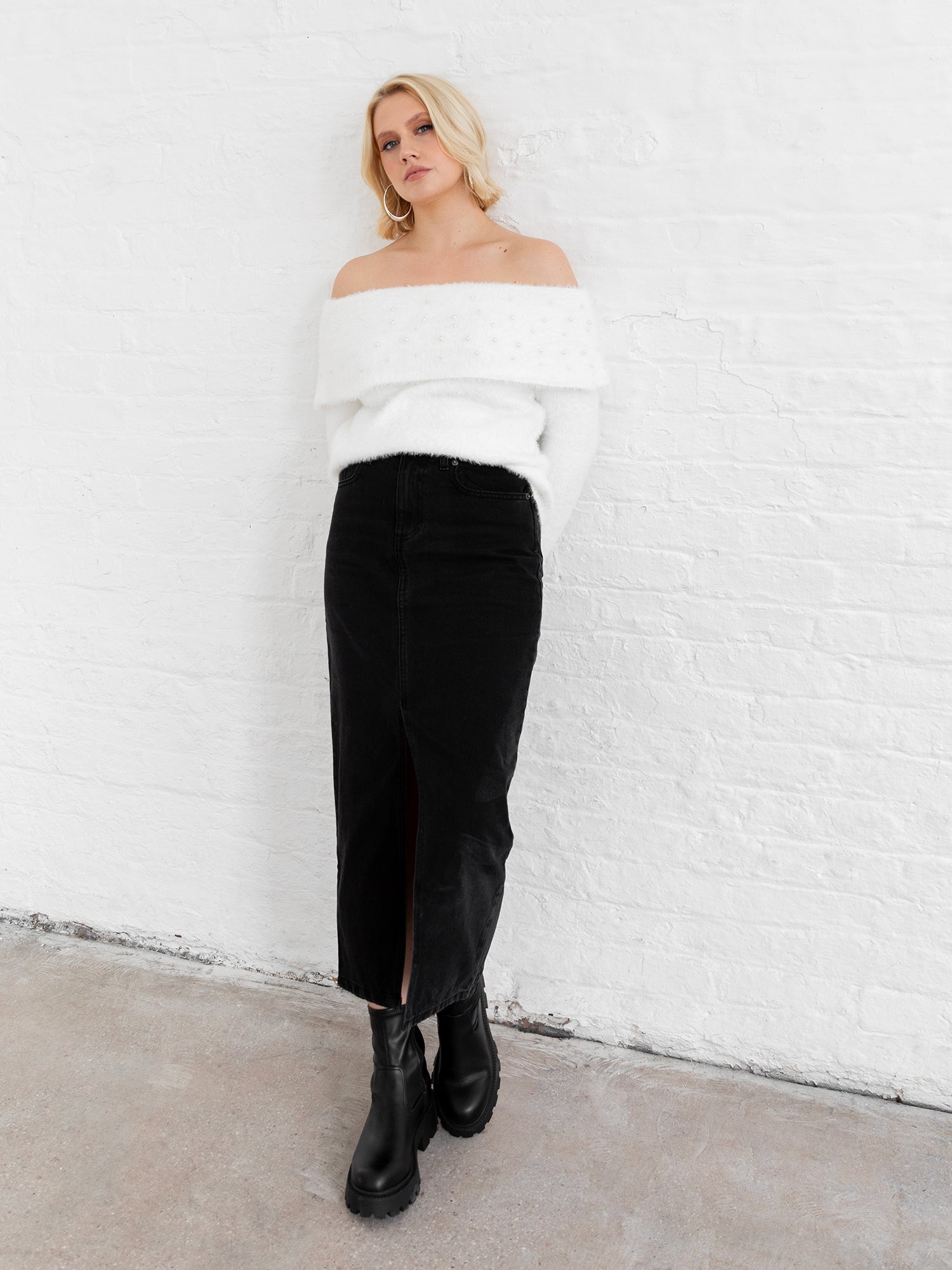 Indulge in the glamour of 'off-the-shoulder' fashion this season. This cosy eyelash knit jumper embraces the trend with its charming folded-over neckline adorned with delicate ivory pearls creating an elegant piece you’ll want to keep in your rotation. Its length makes it versatile piece you can wear tucked in with a skirt and heels for an evening ensemble or layer it over leather trousers for a more understated yet stylish look.