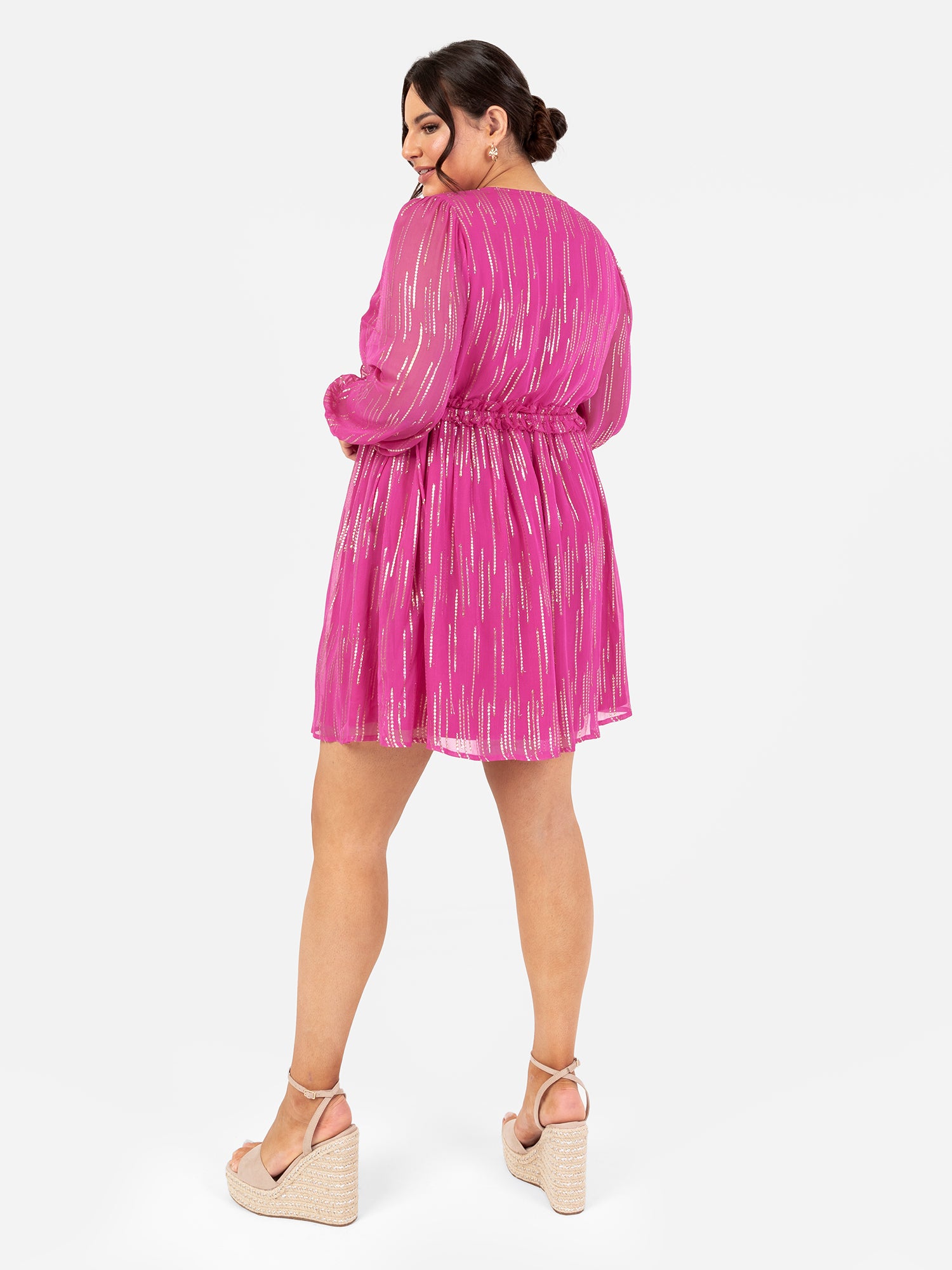 Shake up your going out wardrobe with this shimmering mini from Lovedrobe. Bright pink base offers a stunning backdrop for the gold accents that fall along the long-sleeved bodice and mini skirt creating a captivating and light-catching piece ideal for work events or romantic evenings with your significant other. Adjustable imperial waist is decorated with matching frill adding an extra touch of playfulness. Style this pink piece with platform heels and gold chain shoulder bag.