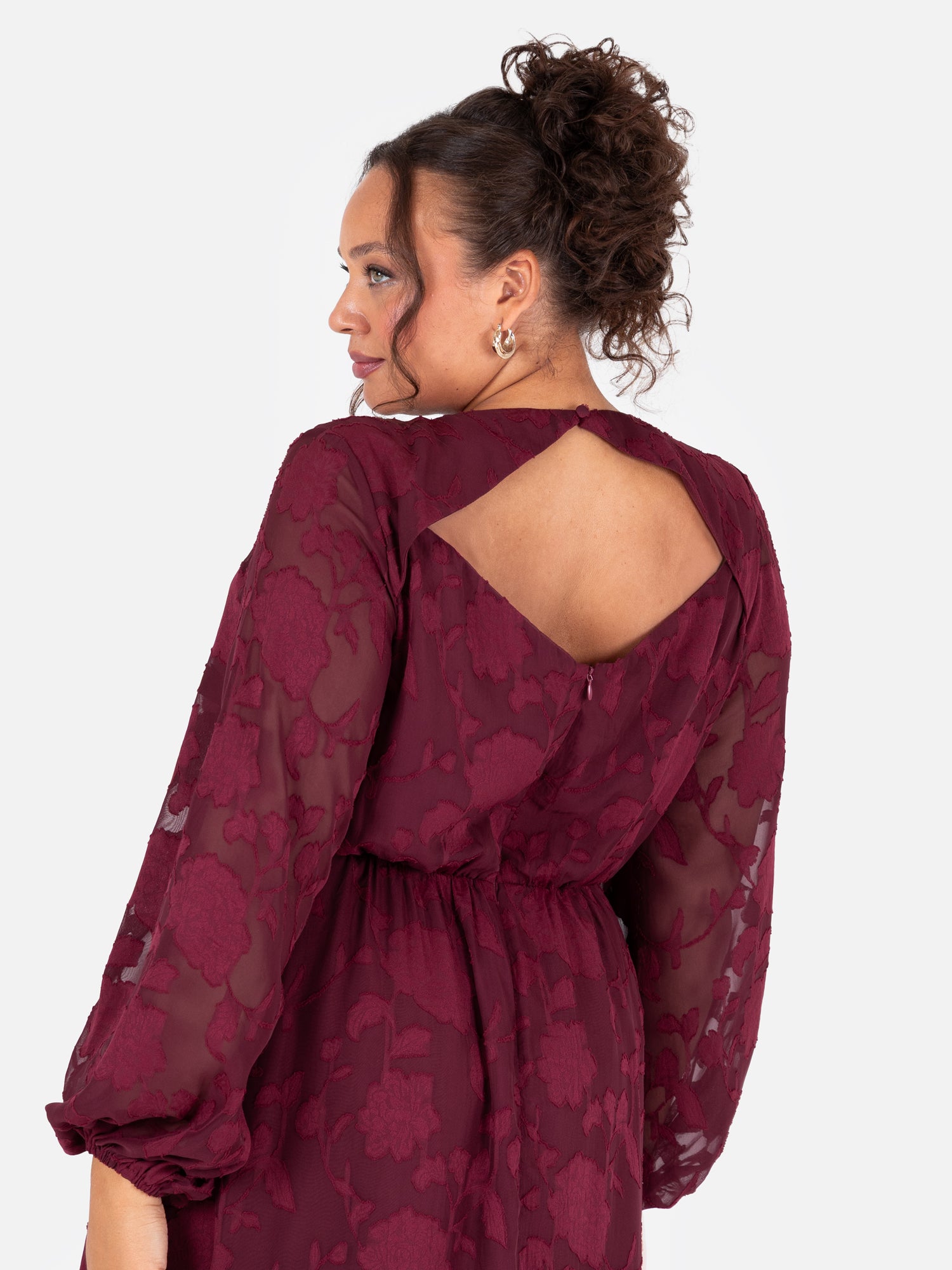 Elevate your wardrobe with this effortlessly elegant dress, crafted from a floral burnout fabric in a muted red hue. The romantic bodice features a classic round neckline and a flattering curved waist, framed by long blouson sleeves with elasticated cuffs for all-day comfort. A keyhole detail at the back, finished with a button-and-loop fastening, adds a charming touch. The A-line skirt is finished with a subtle side split for effortless movement. Style this floral piece with gold heels and a sleek updo to highlight the elegant back detail.