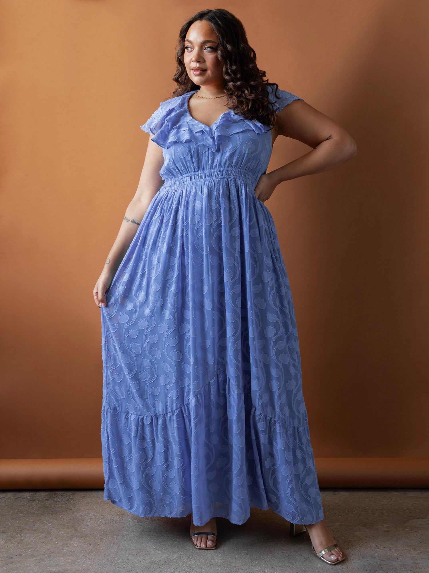 Lovedrobe Blue Ruffle V Neck Floral Burn Out Maxi Dress