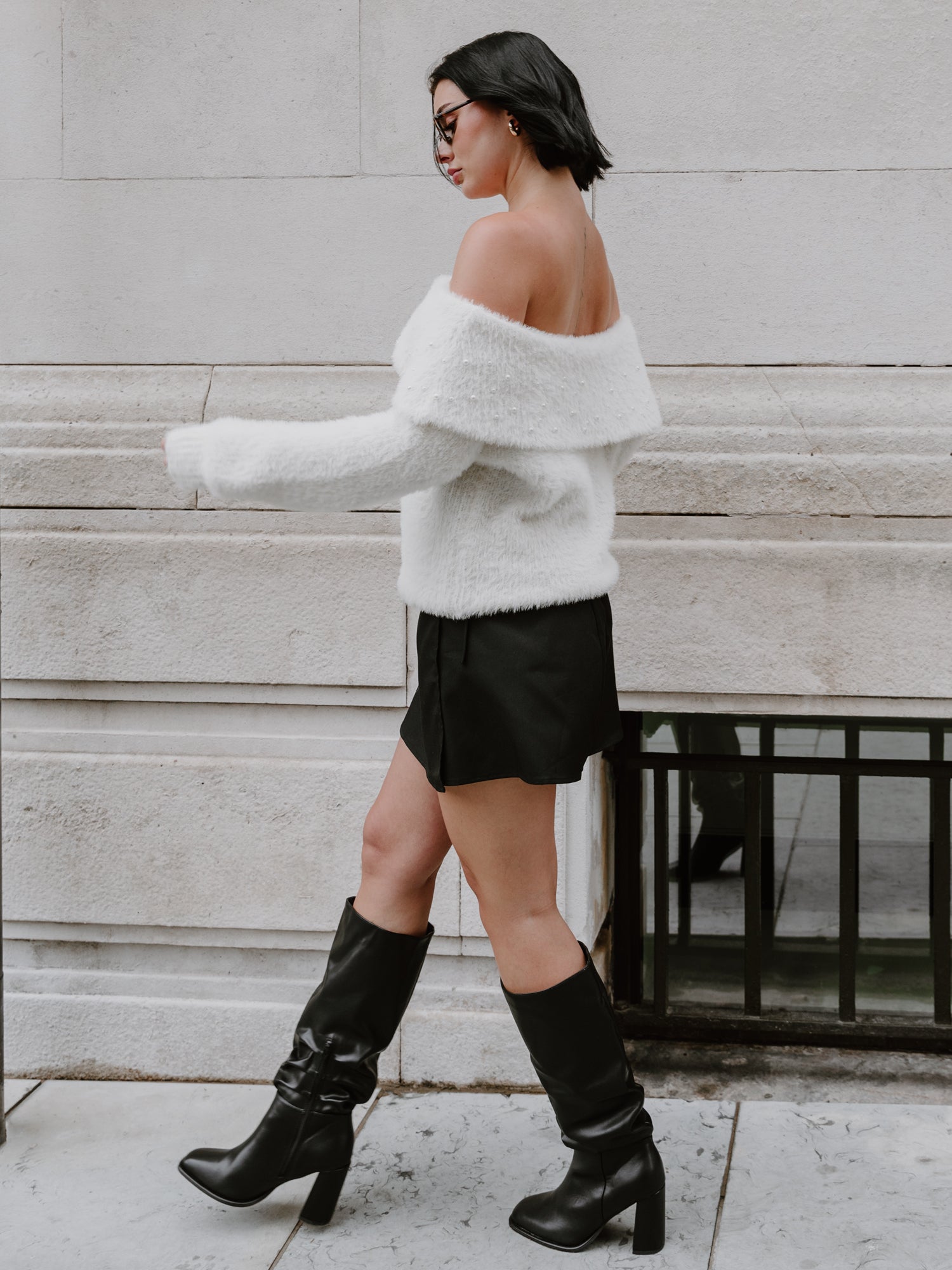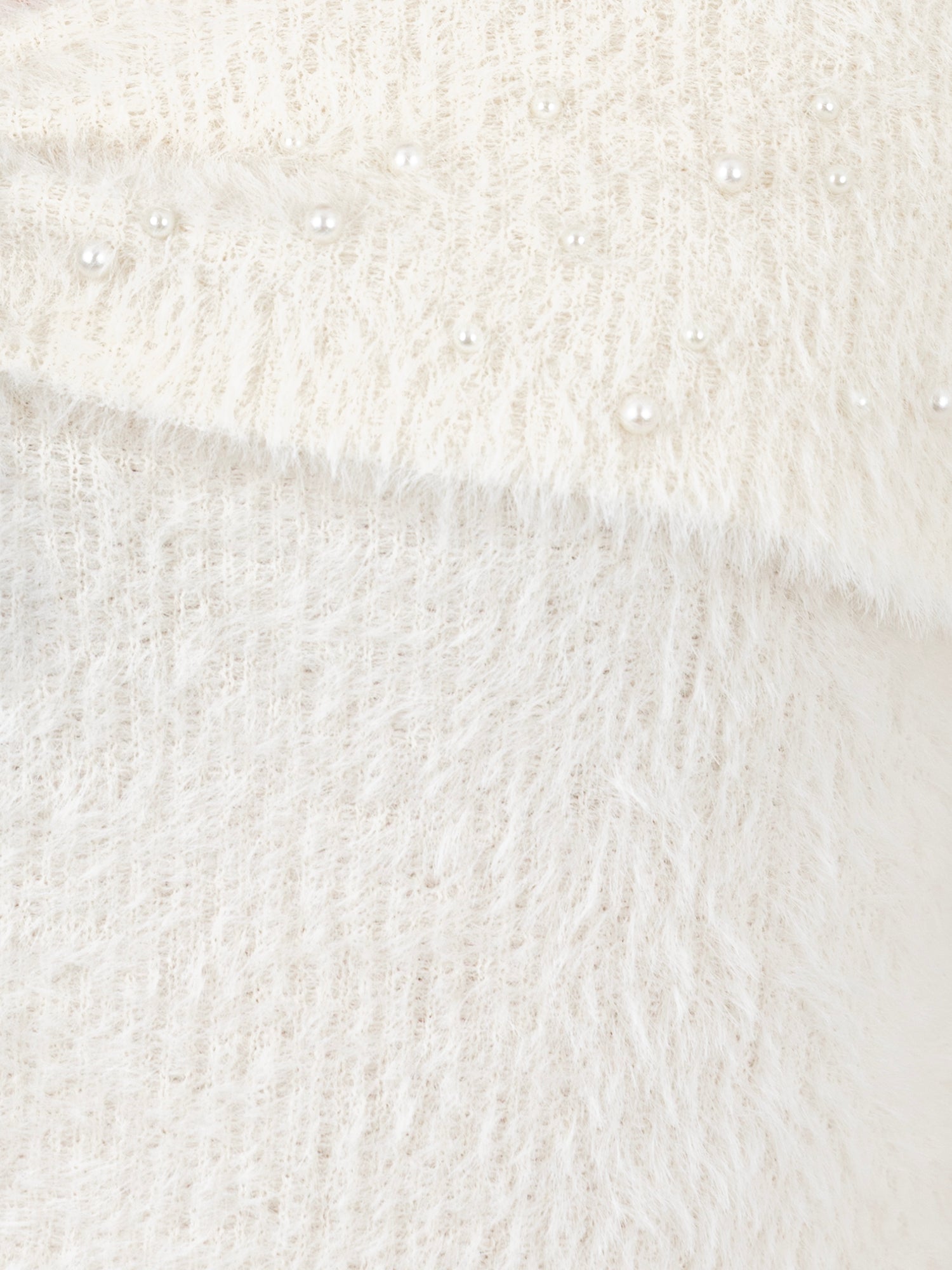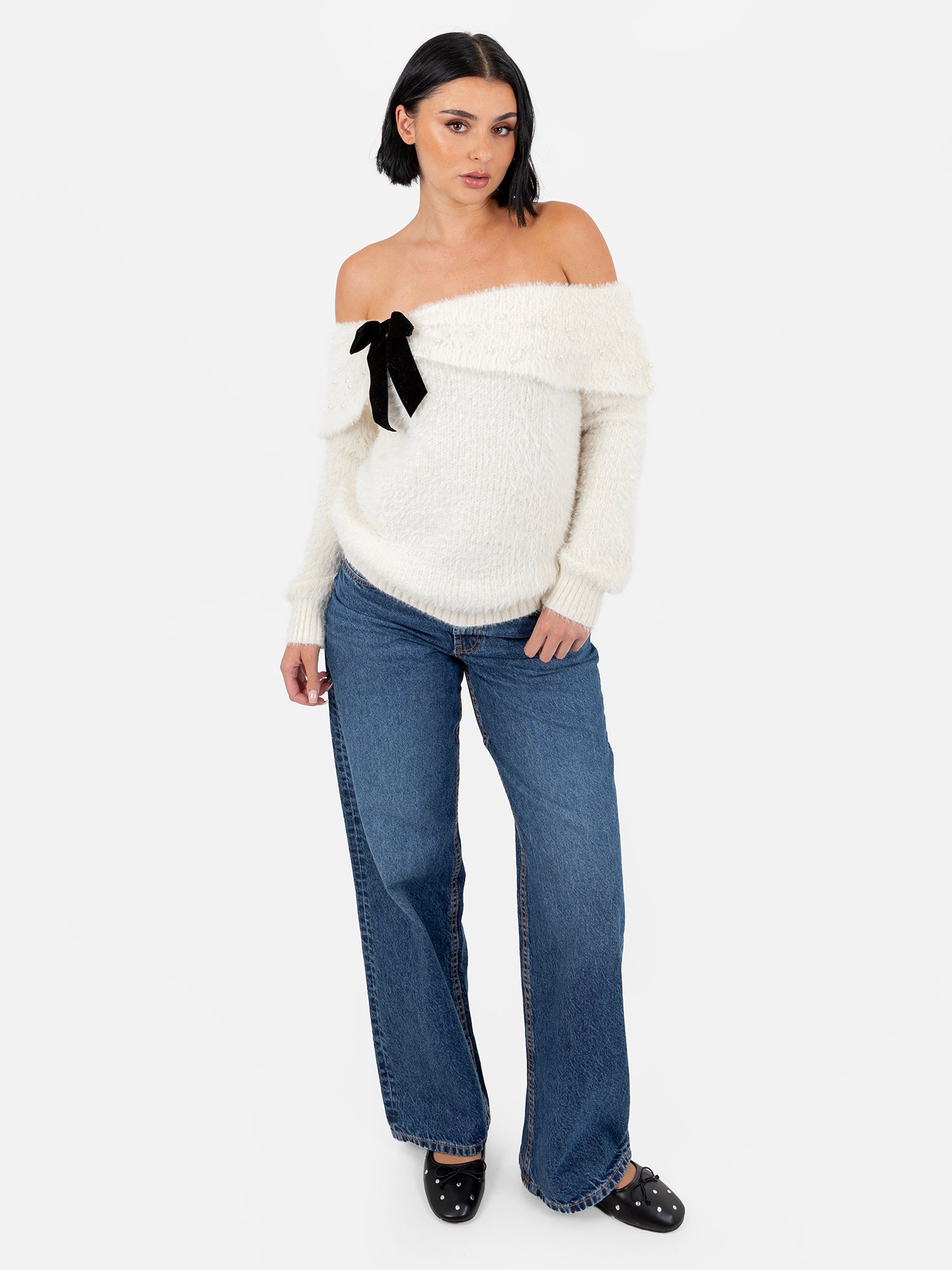 Indulge in the glamour of off-the-shoulder fashion this season. This cosy eyelash knit jumper embraces the trend with a charming fold-over bardot neckline, adorned with delicate ivory pearls and a black velvet bow, creating an elegant piece you'll reach for time and again. Its length makes it a versatile choice, tuck it into a skirt with heels for an evening ensemble, or layer it over trousers for a more understated yet stylish look.