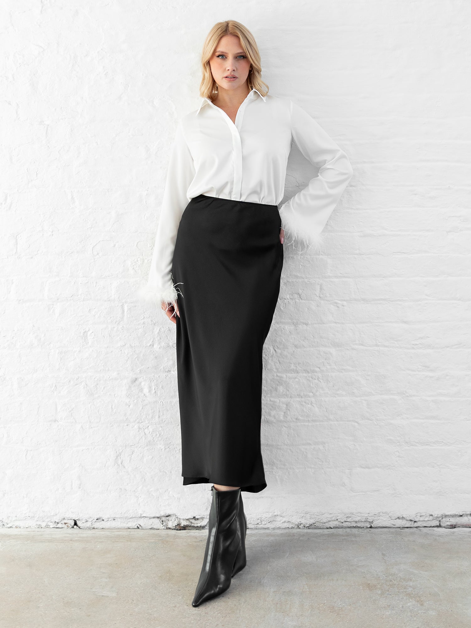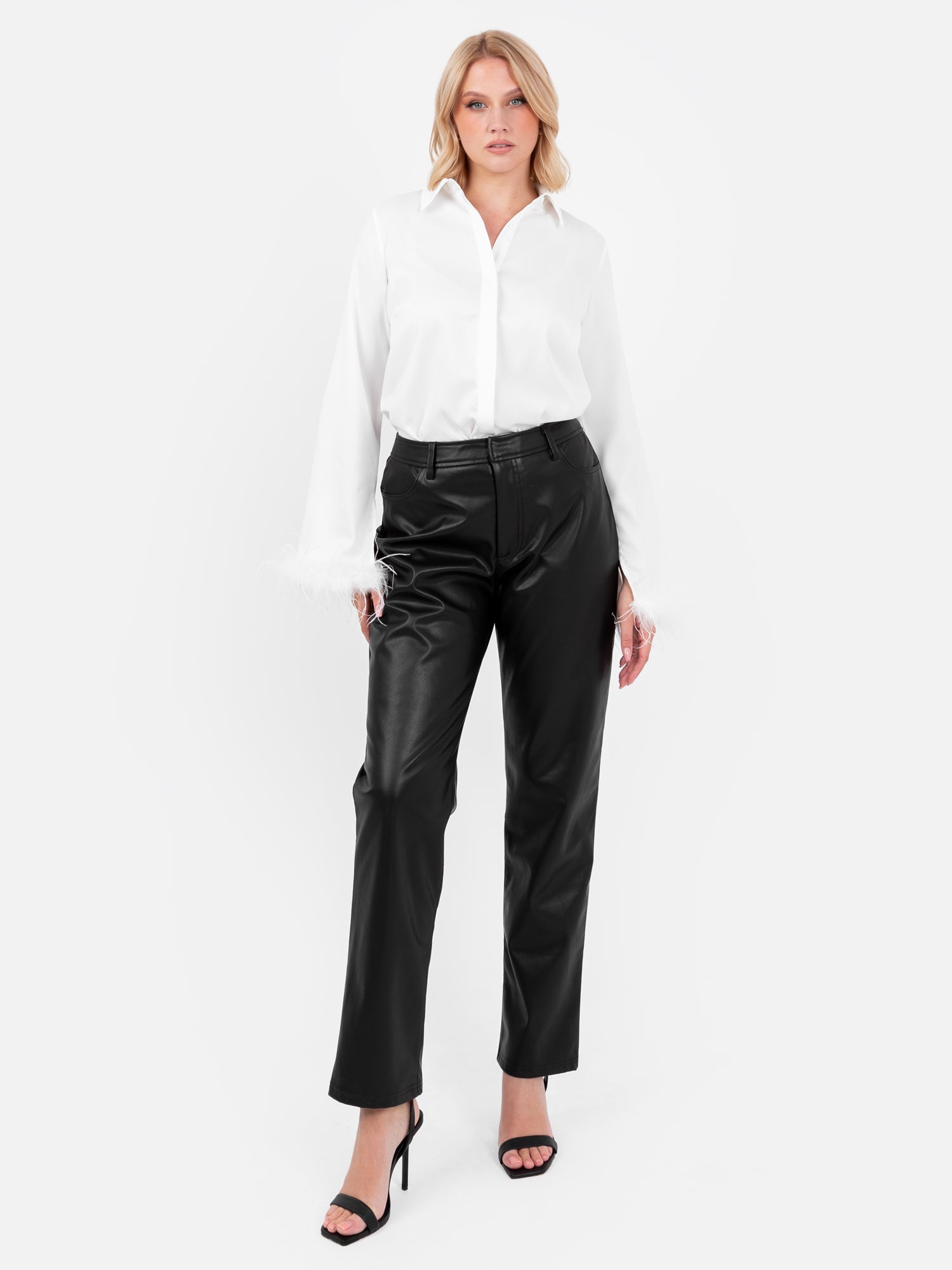 This White blouse will become your go-to styling piece this season. Classic button up design is elevated by the Satin fabric its crafted from as well as the button overlay for a seamless look. Most notably its feather cuffs take this blouse from workwear to party-wear. Style this long sleeve shirt with trousers and heels for a classy ensemble or pair with our Sequin Wrap Midi Skirts for a shimmering party look.