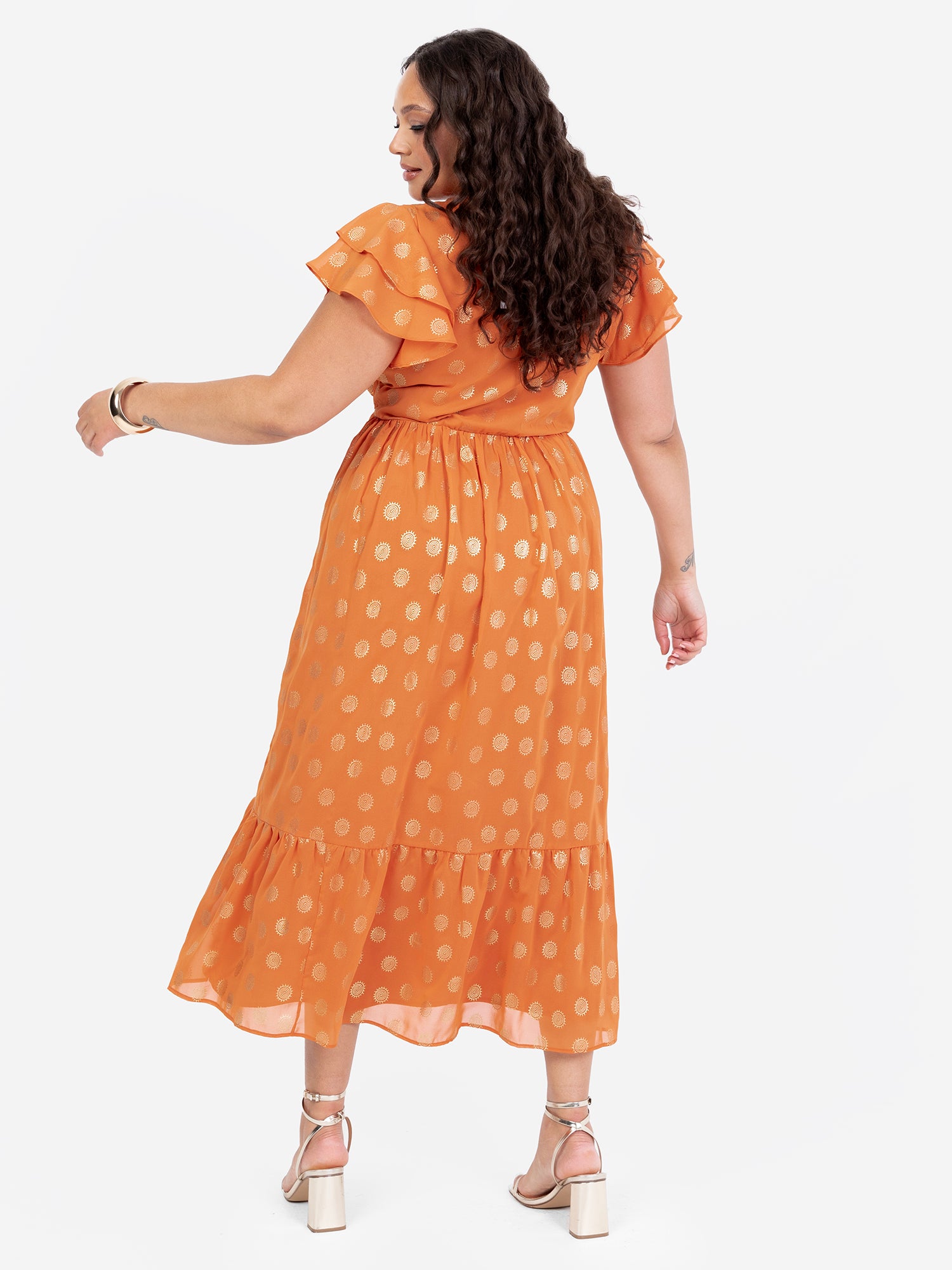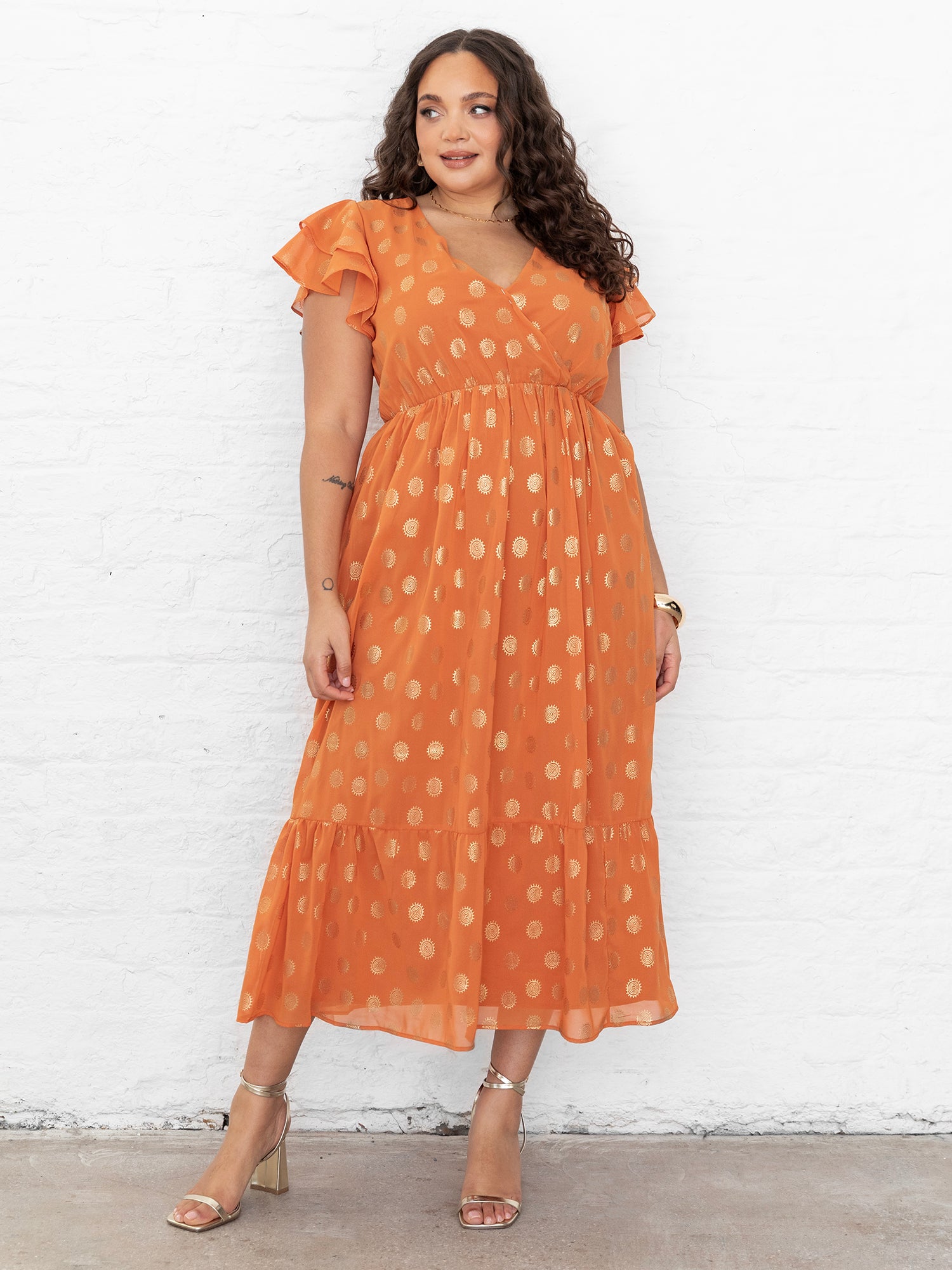 Lovedrobe Orange V Neck & Flutter Sleeve Metallic Detail Midi Dress
