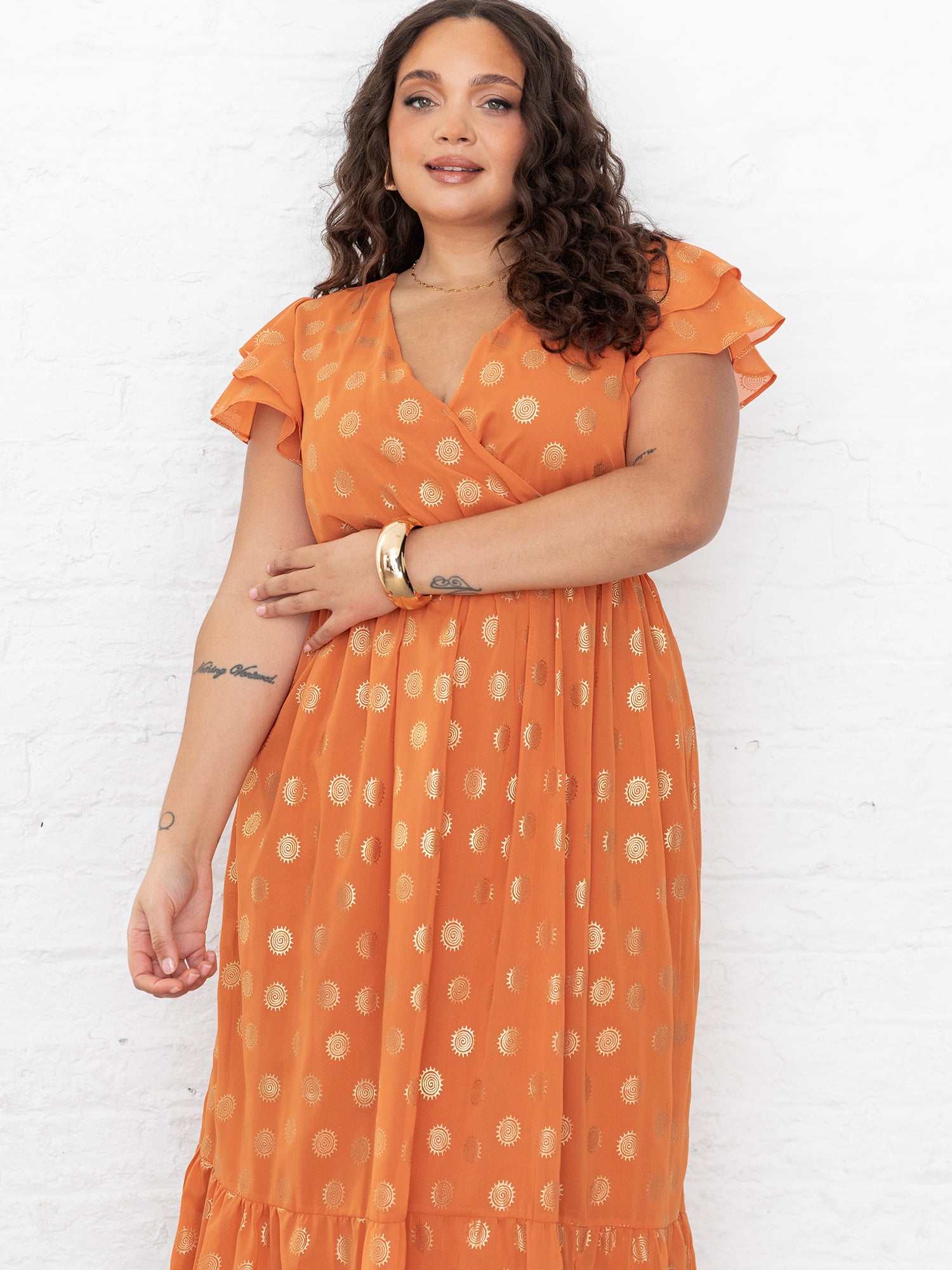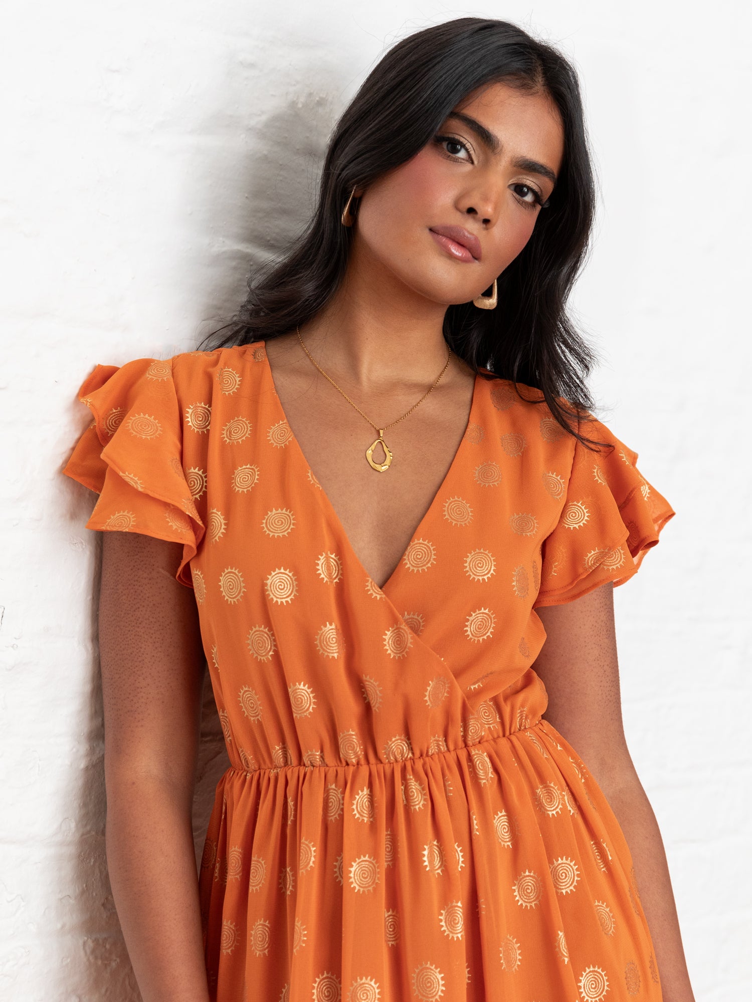 Elevate your wardrobe with this standout orange dress. The faux wrap design creates a timeless V-neckline while short layered sleeves add a touch of charm. An eye-catching metallic finish takes centre stage featuring a meticulously crafted swirl pattern that exudes elegance and flair. Style it with trainers for a relaxed casual vibe or pair it with gold heels and shimmering accessories for an effortlessly chic evening ensemble.