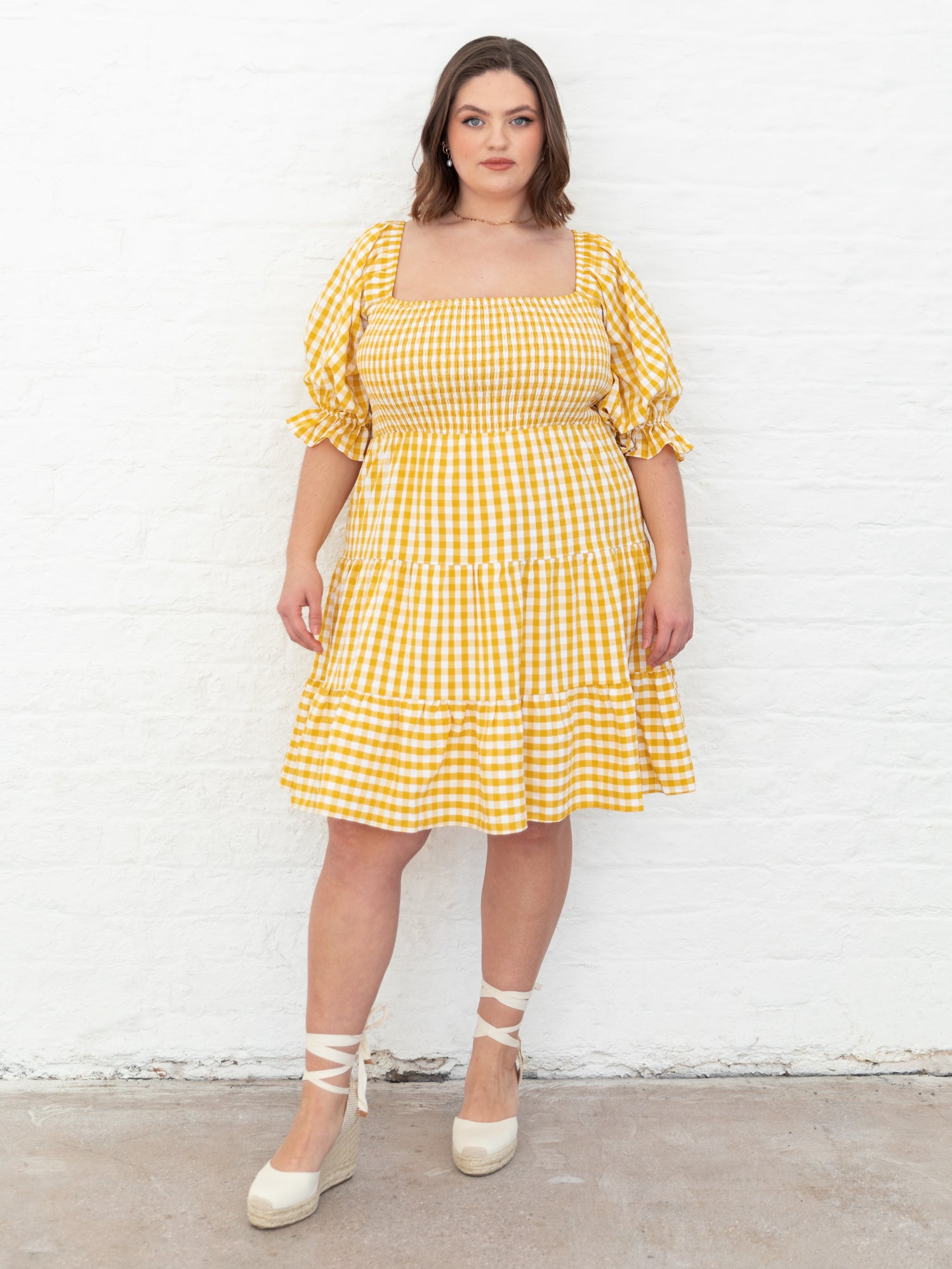 Introducing our elevated Milkmaid Mini perfect for your summertime wardrobe. This yellow rendition features a classic gingham pattern cut into a mini silhouette that embodies the ultimate cottagecore aesthetic. The square neckline is achieved by a shirred bodice complemented by elasticated shoulders that flow into dramatic short puffed sleeves with elasticated cuffs and delicate ruffle detailing. The tiered mini skirt is ideal for the height of summer whether you're enjoying after-work drinks or weekend walks in the park. Pair with sandals or trainers for a relaxed yet stylish look.
