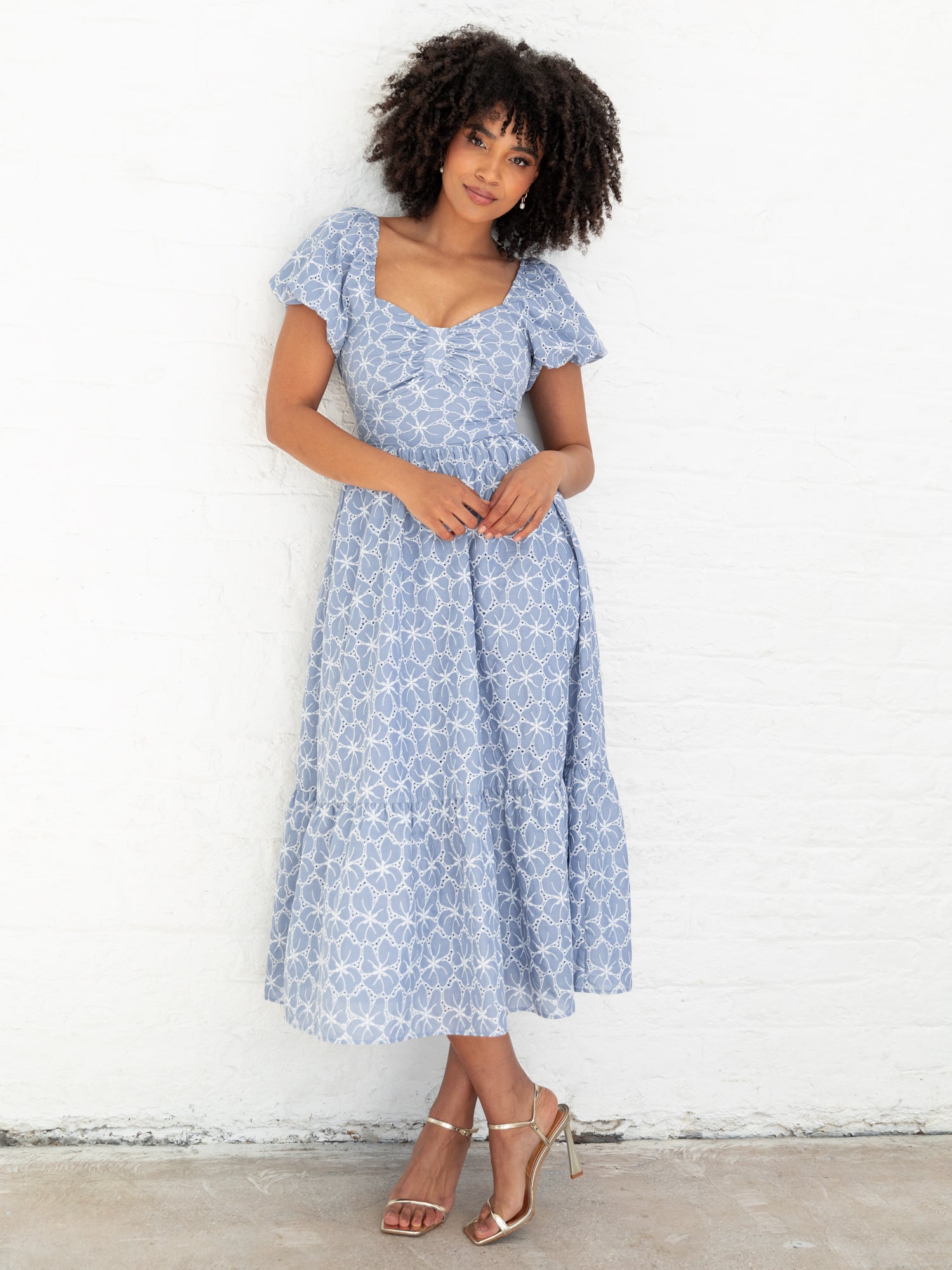 Charming and effortlessly playful our new seasonal favourite is this square-neck tiered midi dress. It's crafted from breathable fabric adorned with delicate cutouts and intricate embroidery radiating versatile femininity. The neckline features an elegant shape and elasticated shoulders for added charm. Its A-line silhouette and short puffed sleeves ensure a relaxed fit while the cut-out back fastens into a striking bow detail. Ideal for any occasion wear this blue midaxi dress with heeled sandals for a romantic dinner date or opt for white trainers to achieve a cool workday look.