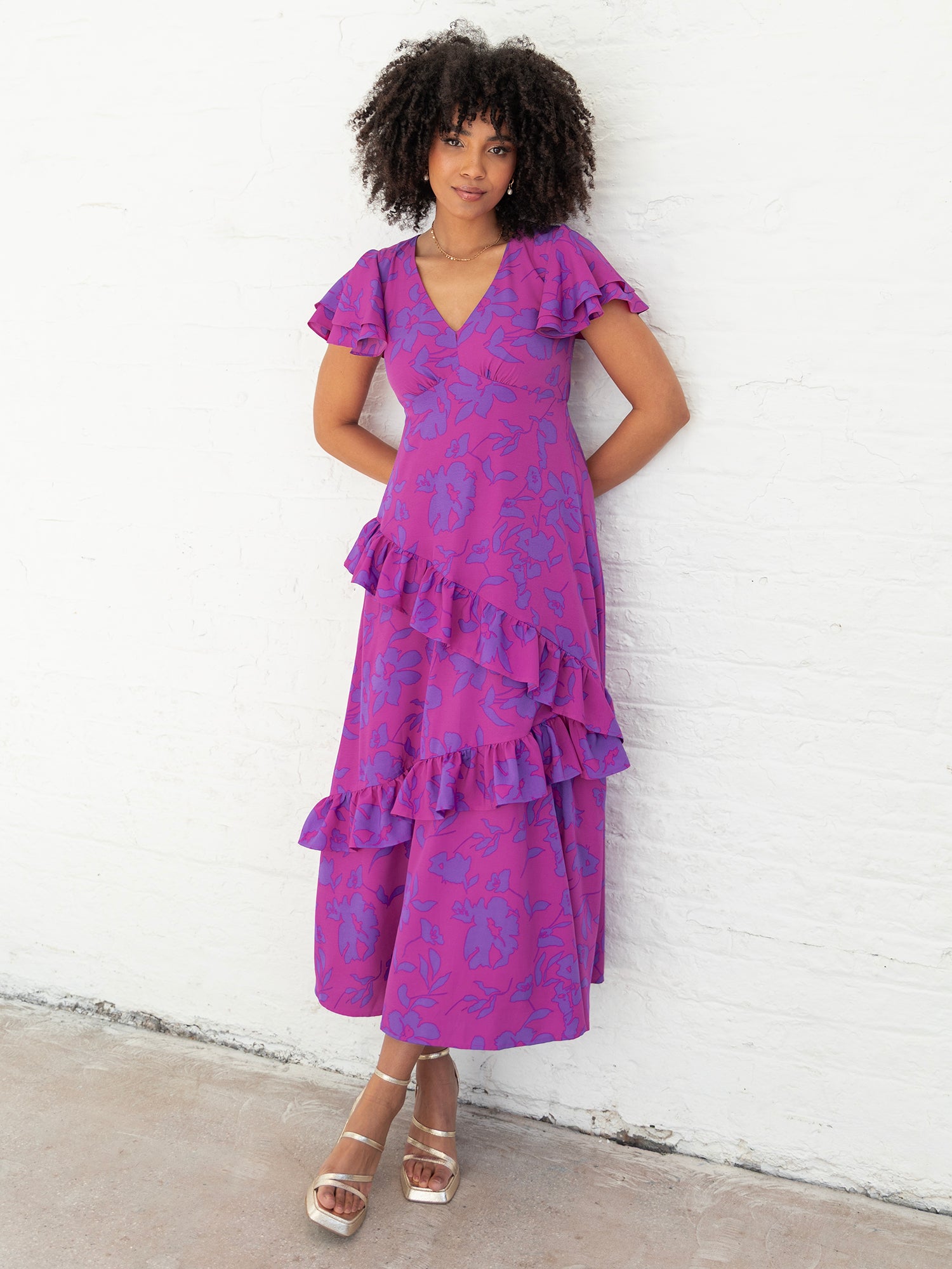 This bright and exciting midaxi dress promises to become a staple for your most memorable occasions. Crafted from lightweight and flowy fabric it features a refined empire waist a classy V-neckline and short flutter sleeves all creating a figure-enhancing look. The captivating floral pattern over a contrasting base makes it ideal for both day and evening occasions. Finished with cascading asymmetric ruffle detailing on the maxi skirt adding dimension and movement. This dress pairs beautifully with strappy heels and understated jewellery.